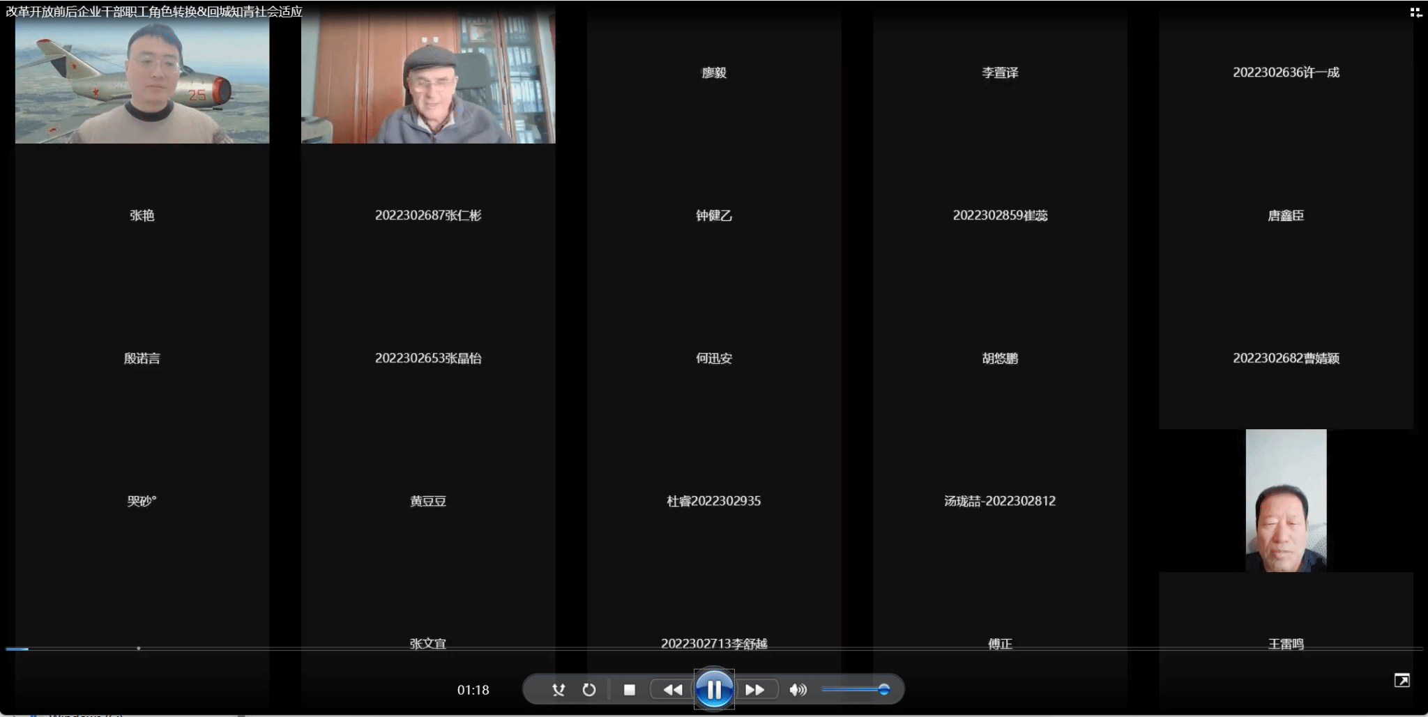 由于访谈对象身份相似性,“改革开放前后知青社会适应”与“改革开放初期国营企业干部职工角色转换”合并举行。这两组访谈聚焦于改革开放起步时期,社会环境变化对个人命运的影响展开,调查对象分布于陕西、北京、浙江的省会城市、中等城市和农村,除了亲身参与过下乡运动的“知青”外,还有接纳过“知青”的农民和“知青”的家属。访谈的对象均是“知青”“上山下乡”运动和改革开放后国营企业改革改制的亲历者。师生还特意邀请了生在北京、长在西安国营草滩农场、曾经在中国和美国都当过工人,在美国取得博士学位并在中美两国高校任教,现居北京的国际共产主义战士后代——阳和平老师。通过访谈,同学们了解了“上山下乡”运动的历史背景及对“知青”一代的影响,“上山下乡”运动在共和国社会主义新农村建设中的历史作用,“知青”返城中的种种境遇,改革开放对“知青”“国营企业”“国营企业干部职工”带来的命运变化。通过访谈,同学们深化理解了改革开放的历史必然性,更加坚定了对中国特色社会主义的信心。