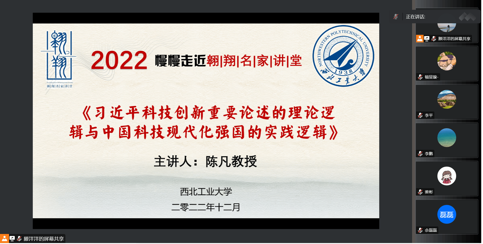 2022年12月6日晚,beat365官网“翱翔名家讲堂”第17期顺利举行,本期嘉宾、东北大学beat365亚洲版官网学术委员会主任陈凡教授以云端报告的方式,为beat365官网师生带来《习近平科技创新重要论述的理论逻辑与中国科技现代化强国的实践逻辑》。报告会由beat365亚洲版官网副院长张云龙教授主持。