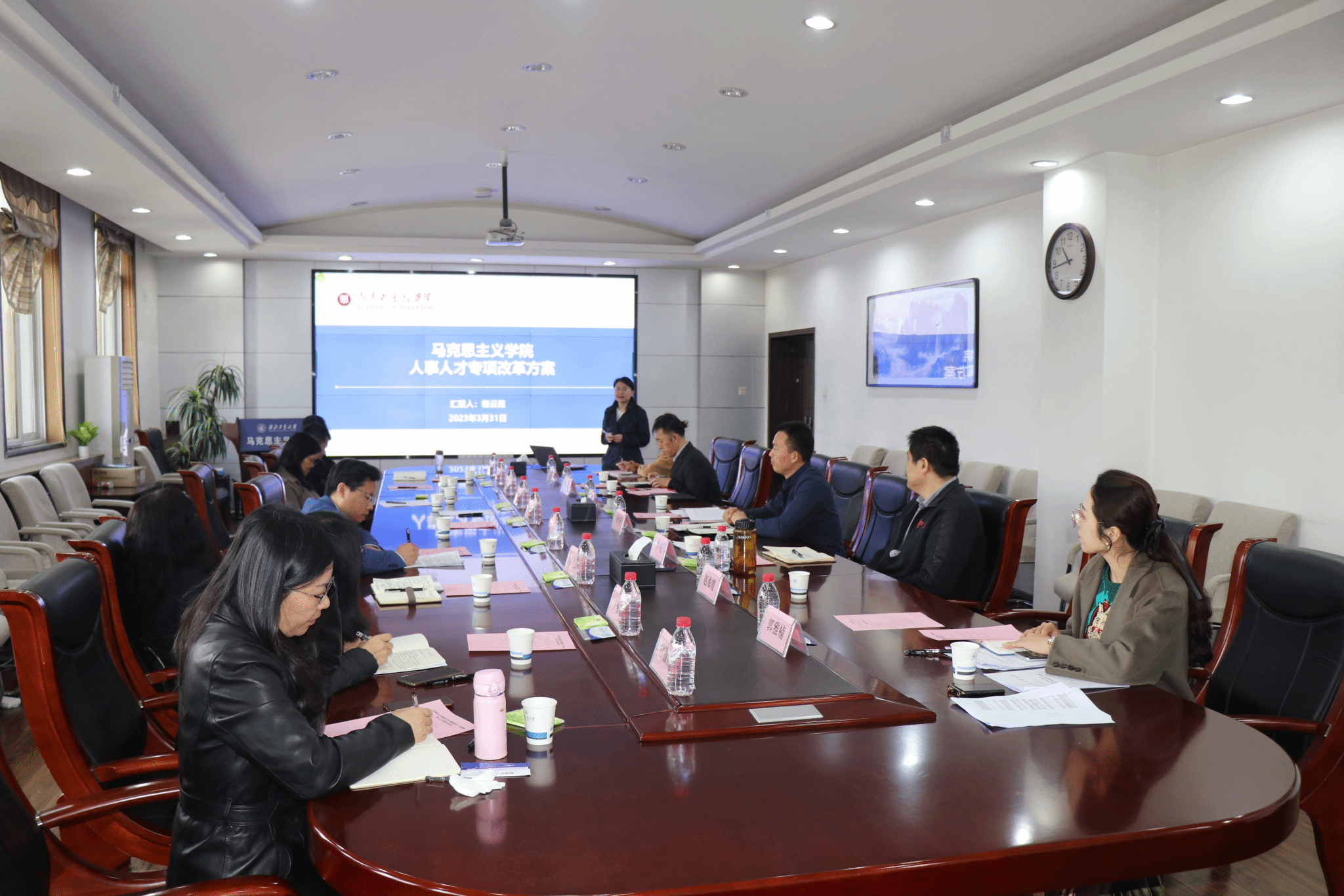杨云霞结合学院具体情况,分别从党对人才工作的全面领导、学院人才人事工作主要改革内容和预期改革的成效方面解读马院《人才工作高质量发展行动计划》的落实情况。她指出,人才是第一资源,要加大人才内培外引力度,坚持“千斤重担大家挑,人人身上有指标”的原则,各系要分解任务、压实责任、开拓思路、拿出实招、推动落实。