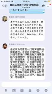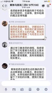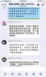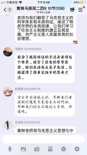 老师还从传统文化蕴含的人生哲理和民族精神角度出发,引导学生正确的世界观、人生观和价值观的形成。在师生互动中,同学们理解了马原课的专业知识,也扩宽了知识视野,提升个人修养内涵和道德素质,形成了乐观的生活心态,一节课在不知不觉中就结束了。这些只是黄琳老师的课堂一角,德国古典哲学中的康德、费希特、黑格尔,古希腊哲学中的赫拉克利特、巴门尼德和柏拉图、亚里士多德,先秦诸子中的老子、庄子、孔子、孟子、朱熹、王阳明、王夫之、《周易》……这些中西方古代哲学思想在她的课上随处可见。不仅深入浅出地讲清楚唯心主义、唯物主义的区分,而且建基于不同的形而上学哲学形态,深刻揭示古今中外辩证法的发展渊源。