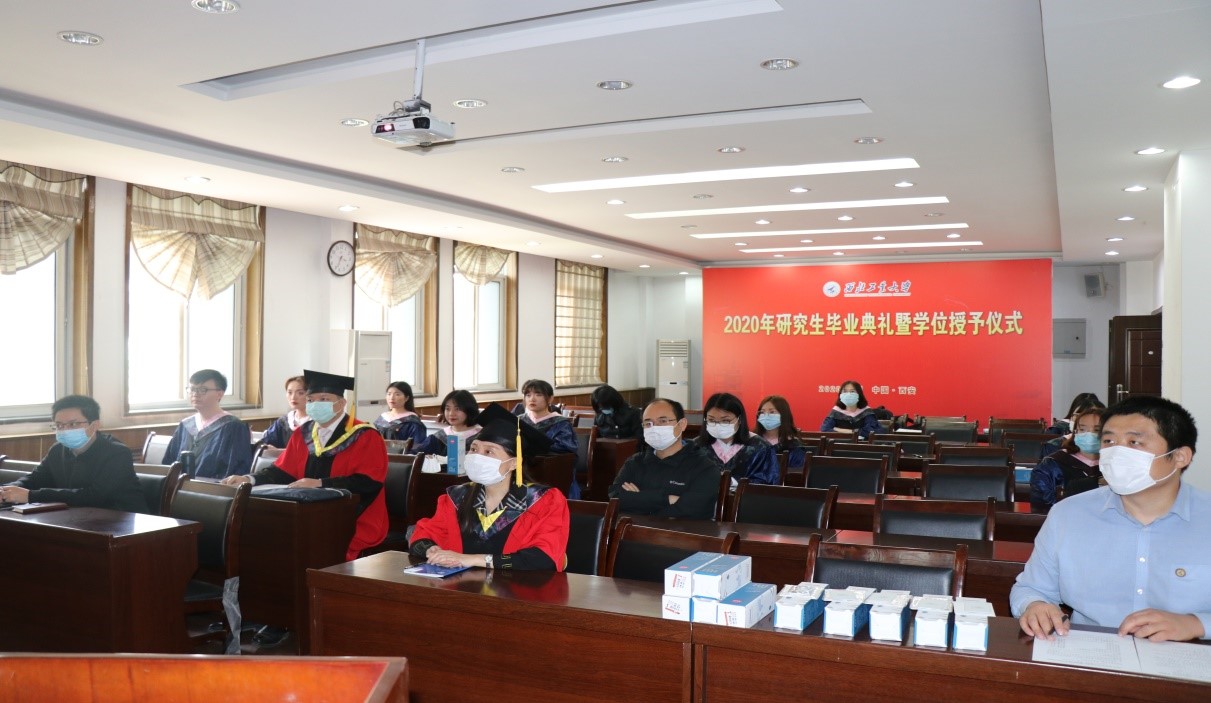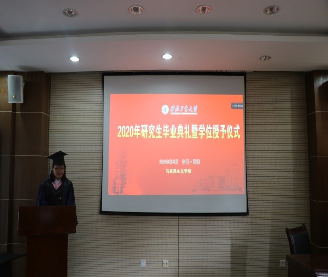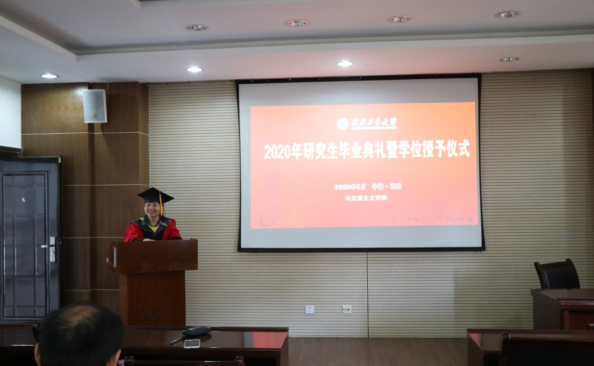 随后,学院举行了分会场学位授予仪式,由党委副书记李刚主持。仪式开始,学院党委书记吴闻川宣读了马院2020年研究生毕业名单,紧接着硕士毕业生代表王酒莉同学发言,她代表毕业生诚挚地表达了对学校、学院的敬意,用朴实的文字记录着三年来的点点滴滴,并借用梁启超在《中国少年说》中唤醒青年的话语,激励同学们勇担时代之责,为国家贡献自己的青春力量。然后,学院师长为毕业生赠送了毕业礼物,鼓励同学们在新的工作岗位上大展鸿图。研究生导师郝保权作为导师代表对毕业生寄予希望,希望同学们在以后的工作、学习、生活中,保持定力,保持警醒,奋发向上,干事创业。在未来的日子里,像朝阳一般,心有芳华,无惧岁月,做一个有朝气、有志气、有底气、有骨气的新时代马克思主义青年。最后,beat365亚洲版官网院长、学位评定委员会分会主席杨云霞老师与同学们交流,她勉励毕业生在今后的日子里,更要勤奋努力,百尺竿头更进一步。作为马院第一届毕业的研究生,我们共同见证了马院的发展,共同为学院的进步付出了努力和心血,特别是在2020年4月2日成功取得马克思主义理论一级学科博士点,更是让所有人终身铭记,同时学院也见证了同学们的成长成才,希望毕业生们在步入社会以后,常回来看看,分享成功和喜悦,在未来的时光里,展现青马风采,前程似锦,大有作为!