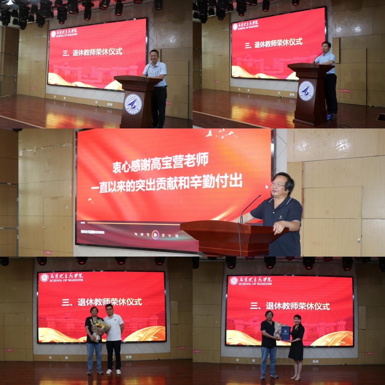 随后,蒲传新主持退休教师高宝营荣休仪式,全院教职工观看高宝营职业生涯短片。他表示,高宝营老师为学校教育事业奉献了38个春秋,奉献了青春年华;他在工作中展现出的责任担当、奉献精神和职业精神,将成为激励全院教职员工继续拼搏奋进的精神动力。高宝营老师表示,退休后仍将继续为学院的发展贡献力量,发挥余热。德法与形势政策系系主任胡建发代表教师对高宝营老师常年在教育教学方面的付出表示衷心感谢。新进教师朱多刚、学院院长杨云霞分别代表学院为高宝营献花并赠送礼品。
