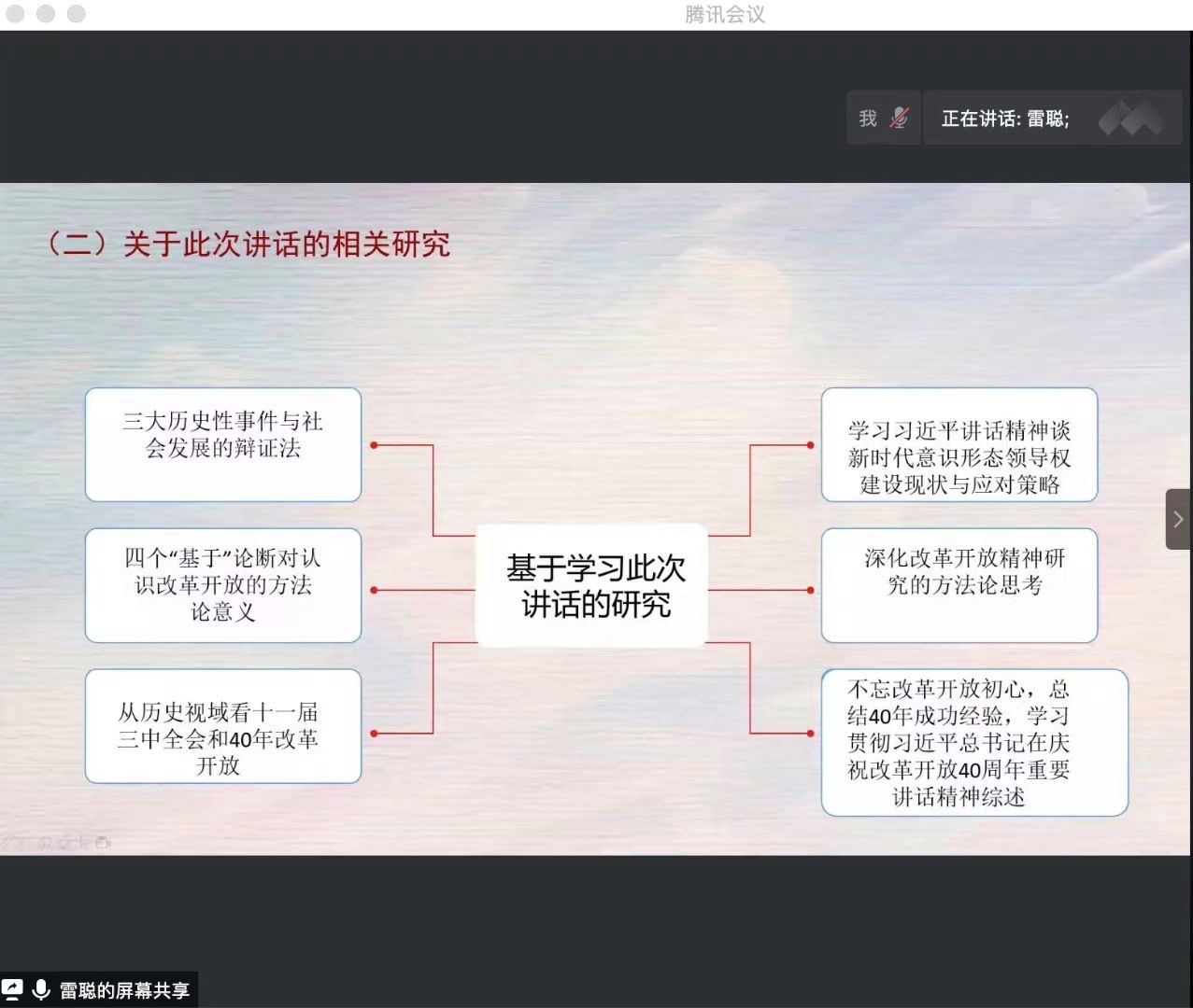 2020年11月28日19点30分,beat365亚洲版官网习近平新时代中国特色社会主义思想学习读书会第六期活动在腾讯会议线上如期顺利举行。此次读书会由我院硕士生谢雨姿主持,特别邀请到上海交通大学beat365亚洲版官网教授、博士生导师,思想政治教育学科负责人史宏波老师作为本次读书会的特邀嘉宾,我院思想政治教育系主任鲁杰老师与多位硕博生共同参加,以《习近平在庆祝改革开放40周年大会上的讲话》作为本次读书会的主要探讨内容,在本次读书会上大家展开了深入的交流与讨论。