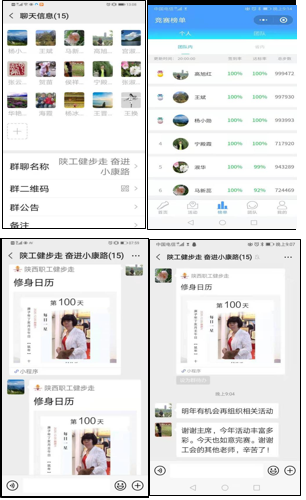 beat365亚洲版官网工会积极响应陕西省总工会等部门联合开展的“我要上全运,奋进小康路”健步走活动的号召,第一时间在全院范围内进行了广泛的宣传和动员,精心组织了一支15位成员的参赛队,并建立了健步走微信群,参赛队员们线上分享劳模故事和健身经验,线下开展形式多样的体育比赛和锻炼活动,在浓厚的健身氛围下,参赛队员们你争我赶、互相提醒、互相监督,形成了一股健身热潮。