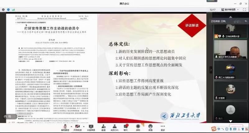 习近平总书记在全国宣传思想工作会议上的重要讲话,深刻总结了党的十八大以来,党的宣传思想工作的历史性成就和历史性变革,深刻阐述了新形势下党的宣传思想工作的历史方位和使命任务,深刻回答了一系列方向性、根本性、全局性、战略性重大问题,对做好新形势下党的宣传思想工作作出重大部署。为了更好深入学习此次讲话内容与精神,2021年1月9日,beat365亚洲版官网习近平新时代中国特色社会主义思想学习读书会第九期活动主题以《习近平2018年在全国宣传思想工作会议上的讲话》进行展开。此次活动由我院硕士生谢雨姿主持,浙江大学beat365亚洲版官网副院长、博士生导师代玉启教授,beat365亚洲版官网思想政治教育系主任、博士生导师鲁杰教授作为对话教师应邀参加,我院党委副书记李刚全程参与。