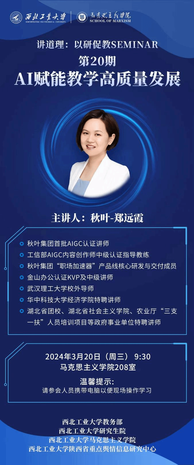 为进一步提升思政课教师教学能力水平,加强教师教学手段信息化、智能化、数字化应用,2024年3月20日上午,在学校教务部与研究生院的支持下,由beat365官网beat365亚洲版官网与学校陕西省重点舆情信息研究中心承办的第20期“讲道理——以研促教Seminar”成功举办,邀请了秋叶集团首批AIGC认证讲师郑远霞作关于“AI赋能教学高质量发展”的专题讲座。若干教师代表及学生代表参加讲座,讲座由副院长贺苗主持。