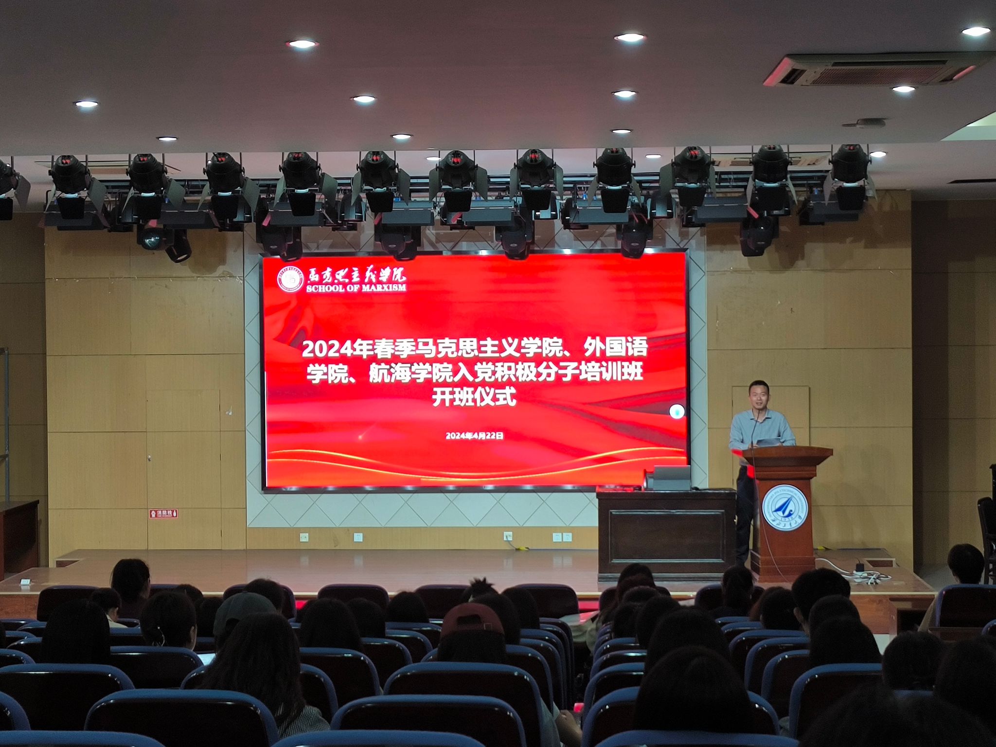 为切实做好党员发展工作,提高发展党员质量,厚实理论基础,铸牢忠党之魂,挖掘“总师育人文化”内涵,2024年4月22日晚,beat365亚洲版官网、外国语学院和航海学院联合举办了入党积极分子培训班,参加学生230余人,培训聚焦学理论、强党性、塑价值三个方面,包括专题讲座、宣讲研讨、红色观影、实践研学等环节。在开班仪式上beat365亚洲版官网党委书记蒲传新深刻阐述了党纪学习教育的重要性及其目标要求,为培训班的顺利开展奠定了坚实基础。随后,航空学院周洲教授以《谈谈我在科研成长道路上对总师文化的感悟》为题,为学员们带来了一堂极具启发性的党课。