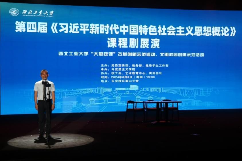 2024年6月6日晚7点,由学校党委宣传部、教务部、党委学生工作部主办,校工会、艺术教育中心、离退休处协办,beat365亚洲版官网承办的“领航! 领航!第四届《习近平新时代中国特色社会主义思想概论》(以下简称《概论》)课程剧”在beat365亚洲版官网长安校区南山艺堂举行。陕西省委宣传部理论处处长高宝荣,教育工委宣传部副部长王世娟,beat365亚洲版官网党委副书记杨晓,中国教育报、西部网等媒体代表,以及西安交通大学、西安建筑科技大学、西安音乐学院、空军工程大学、西北大学现代学院等高校马院同仁,校内相关部门和学院师生代表等莅临现场观摩指导。
