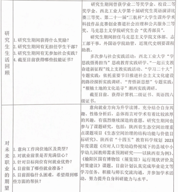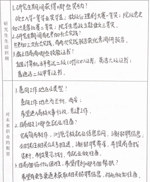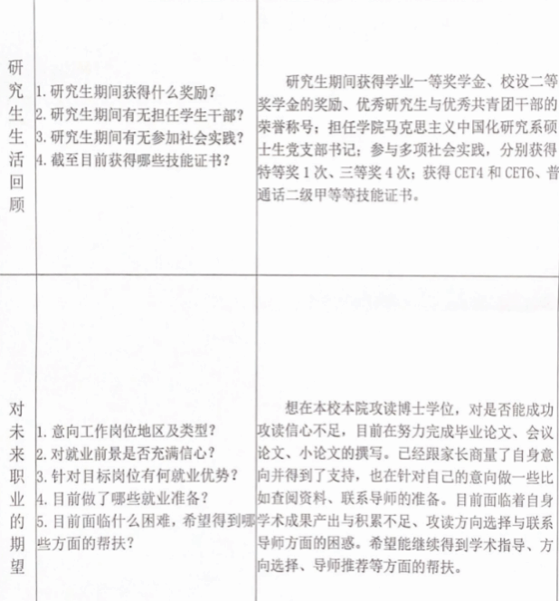 本次精准帮扶工作做到了有重点、有特点、有节点。帮扶老师通过和学生谈话,详细了解学生的基本信息、学业情况、就业创业意向、就业进展情况等,在此基础上,根据每位学生确定的就业意向,制定不同的帮扶方案,做到“一人一策”,筛选合适的就业信息传达给学生,达到了“点对点”服务的帮扶效果。同学们在谈话过程中也收获颇多,对当前马克思主义理论学科的就业形势、个人的就业方向、求职技能掌握等都有了全面的了解,开启了个人求职就业的第一站。