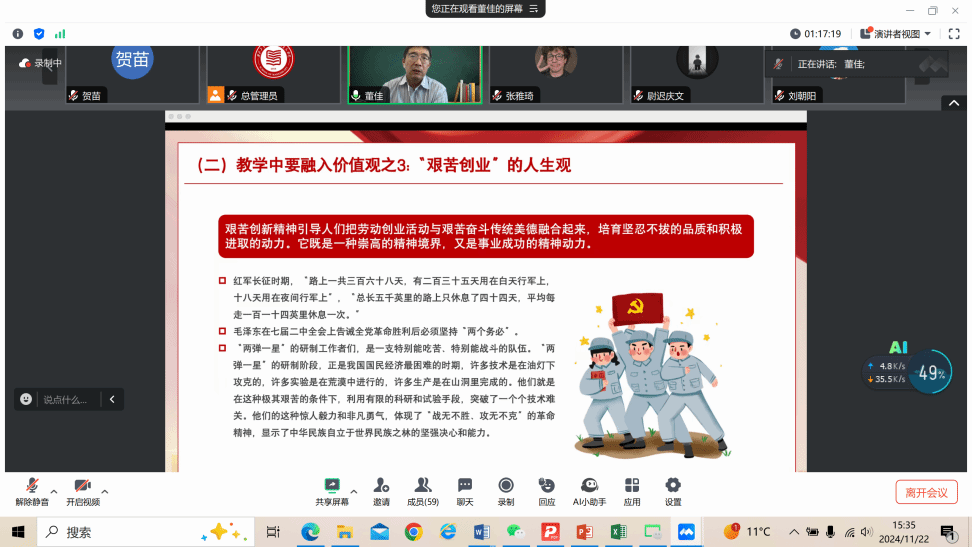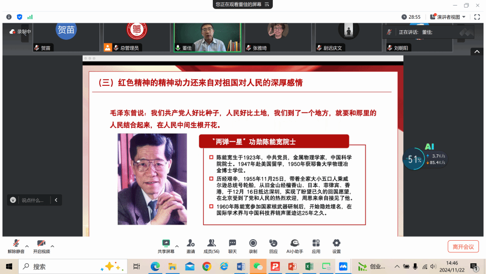 为深入学习贯彻党的二十届三中全会精神,进一步提升思政课教学质量水平。11月22日下午,beat365亚洲版官网邀请到中国人民大学延安十三年与中国式现代化研究院副院长董佳教授带来了一场主题为“新时代红色精神有机赋能思政课教学研究”的精彩讲座。本次会议由beat365亚洲版官网教务部、党委宣传部和beat365亚洲版官网主办,西安工业大学、西安翻译学院、陕西青年职业学院、西安欧亚学院等校beat365亚洲版官网共同协办。讲座由beat365亚洲版官网副院长贺苗主持。