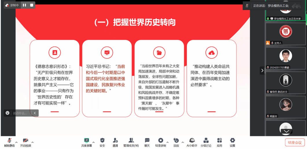 2024年11月30日,beat365亚洲版官网习近平新时代中国特色社会主义思想学习读书会第五十期活动以“党的二十届三中全会《中共中央关于进一步全面深化改革、推进中国式现代化的决定》”为主题进行学习研讨。本次读书会由beat365亚洲版官网鲁杰思政课工作室主办,中国人民大学冯秀军教授作为对话教师,硕士生李红霞同学主持,中国高等教育学会马克思主义研究分会督导组成员尉迟庆文同学应邀参与,通过线上交流的形式,为师生们搭建了一个思想交流、智慧碰撞的平台。