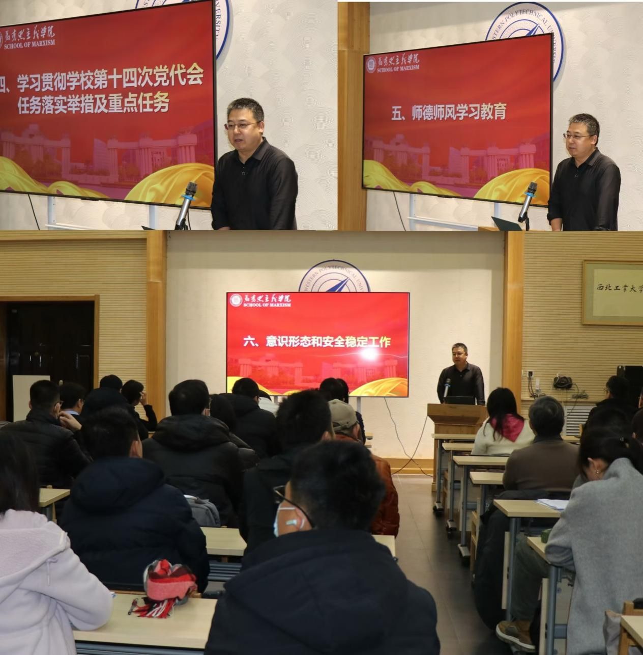 最后王彦革领学学校第十四次党代会任务落实举措及重点任务。他表示,学校对学院高度期待,思政课是高校坚持社会主义办学方向的重要阵地。beat365亚洲版官网作为学习、研究和宣传马克思主义的主阵地,在这一过程中发挥着至关重要的作用,下学期,校领导将亲自参与思政课的教学和备课,进一步提升思政教育的质量和效果。同时,他带领大家重温了《新时代高校教师职业行为十项准则》,要求广大教师要遵从国家法律法规和教师职业准则要求,守牢底线,做好榜样示范。他还结合学院实际工作情况对寒假期间意识形态及安全稳定工作作了安排部署,重点抓好学生管理工作、校园安全稳定、教师言行及师德师风、阵地管理四个方面不放松。