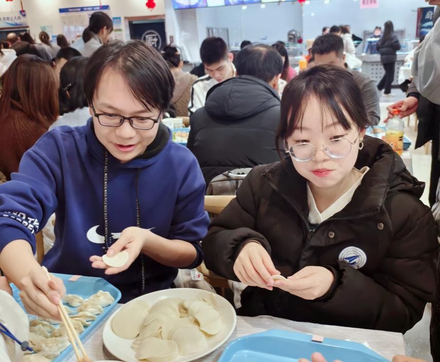 学院院长杨云霞、党委书记王彦革、副院长张云龙、副院长贺苗以及党委副书记耿云辉与学院师生欢聚一堂,围坐一起,大显身手,争当“饺饺”者。“金元宝”“柳叶饺”“平安饺”……轮番出场,好不热闹!