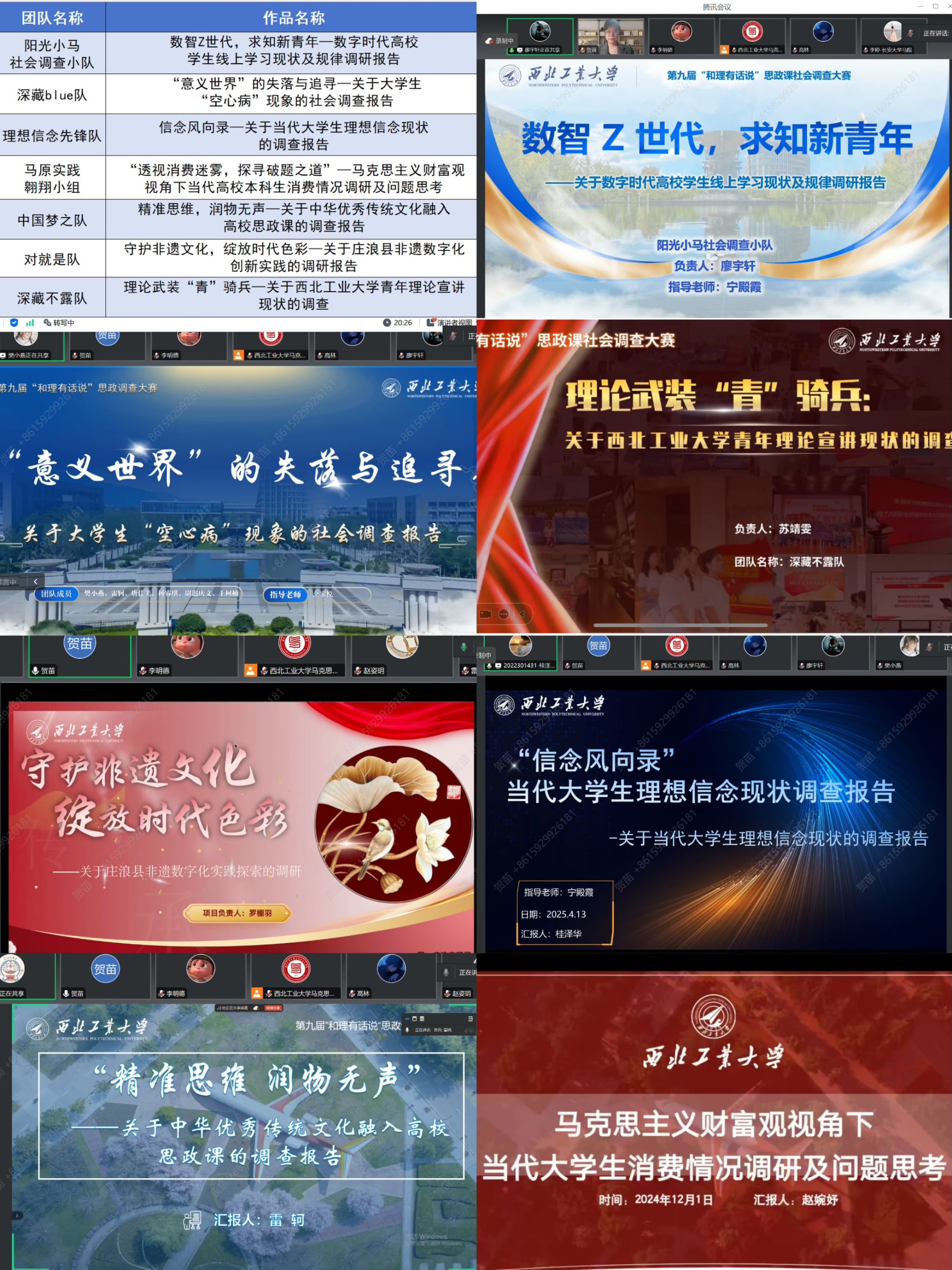 2025年4月13日晚7:00,由beat365亚洲版官网党委学生工作部、共青团beat365亚洲版官网委员会、beat365亚洲版官网教务部、beat365亚洲版官网研究生院、beat365亚洲版官网、beat365亚洲版官网陕西省重点舆情信息研究中心联合举办的第九届“和理有话说”思政课社会调查大赛暨成果展示通过线上形式顺利举办。会议邀请到西安交通大学李明德教授、长安大学李婷教授、beat365亚洲版官网党委学生工作部副部长、学生处副处长管峻担任评审专家,会议由beat365亚洲版官网副院长、舆情中心副主任贺苗主持。