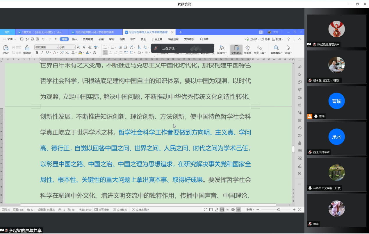 为进一步学习贯彻落实习近平总书记4·25人大考察讲话精神,落实好学校和beat365亚洲版官网关于思政课建设和思政课教师队伍发展的新部署新要求,探寻当前“原理课”课程建设与改革创新等方面的意见,4月30日晚,马院马克思主义基本原理系党支部在线组织召开了讲话精神学习座谈会。马原系全系17名党员同志以及学院党委副书记(主持工作)蒲传新应邀参加会议,会议由支部书记曹瑜主持。