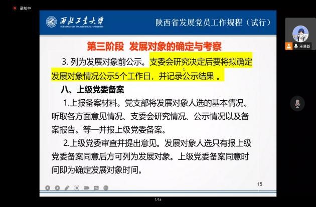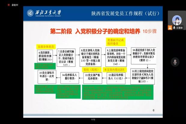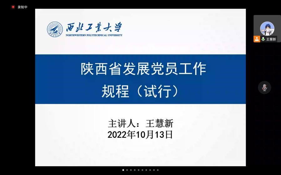 为进一步增强党课培训的针对性与实效性,努力培养理想信念坚定、综合素质优良的党员队伍后备力量。2022年10月13日上午,在腾讯会议上开展了主题为《陕西省发展党员工作规程(试行)》的党课培训,本次培训由beat365亚洲版官网马克思主义基本原理系硕士生党支部书记王慧新主讲,beat365亚洲版官网、民航学院160余名入党积极分子、发展对象参加本次党课培训,旨在通过理论学习来加深入党积极分子、发展对象对党员发展流程的认识,形成正确的入党动机。