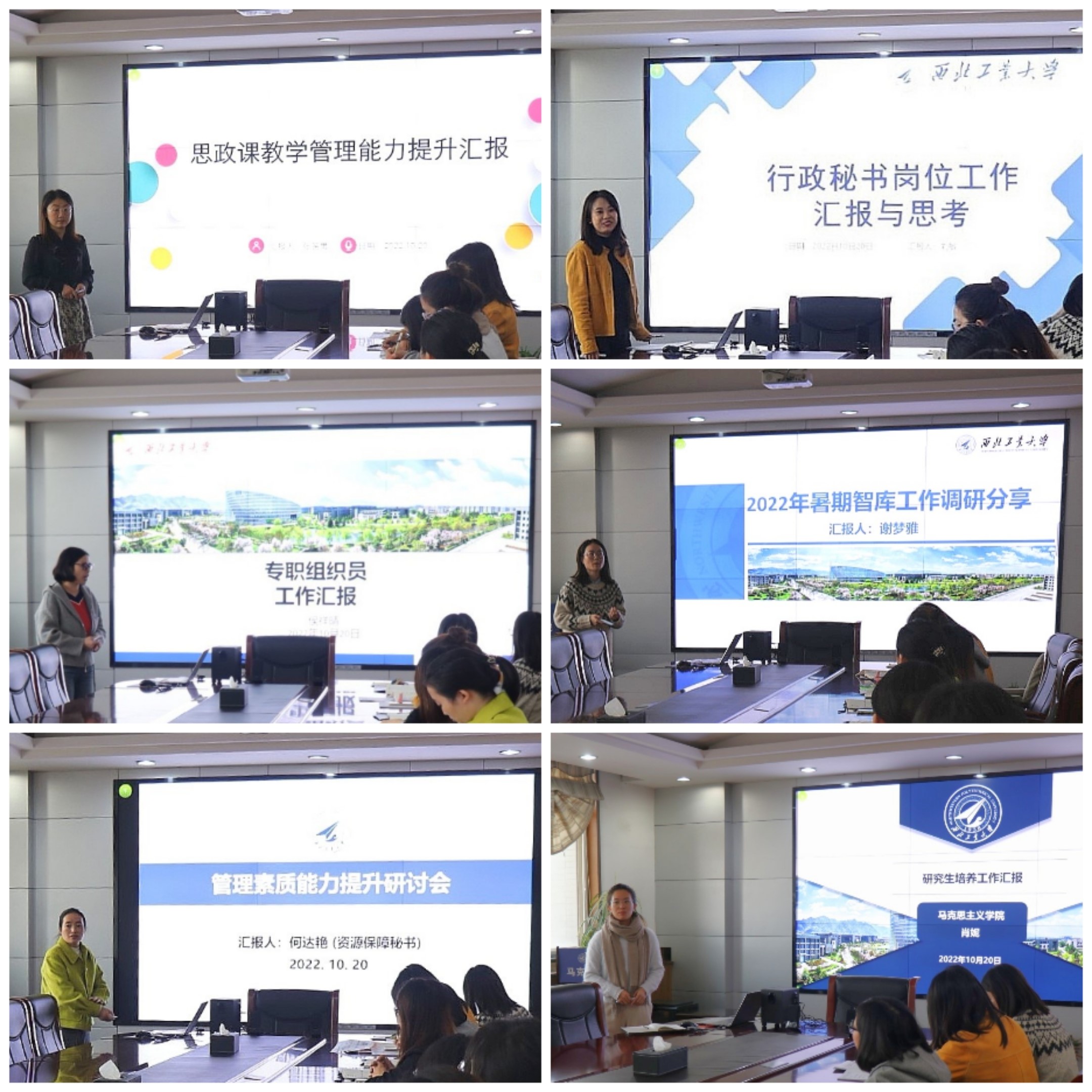 此次会议研讨围绕公共课教学、行政工作、党建工作、舆情中心建设工作、教学档案管理、研究生培养工作展开,各相关秘书从自己岗位工作出发,结合对全国部分重点高校和工信部高校的beat365亚洲版官网调研情况,分享调研成果,汇报岗位工作,交流岗位经验并对未来工作进行规划。