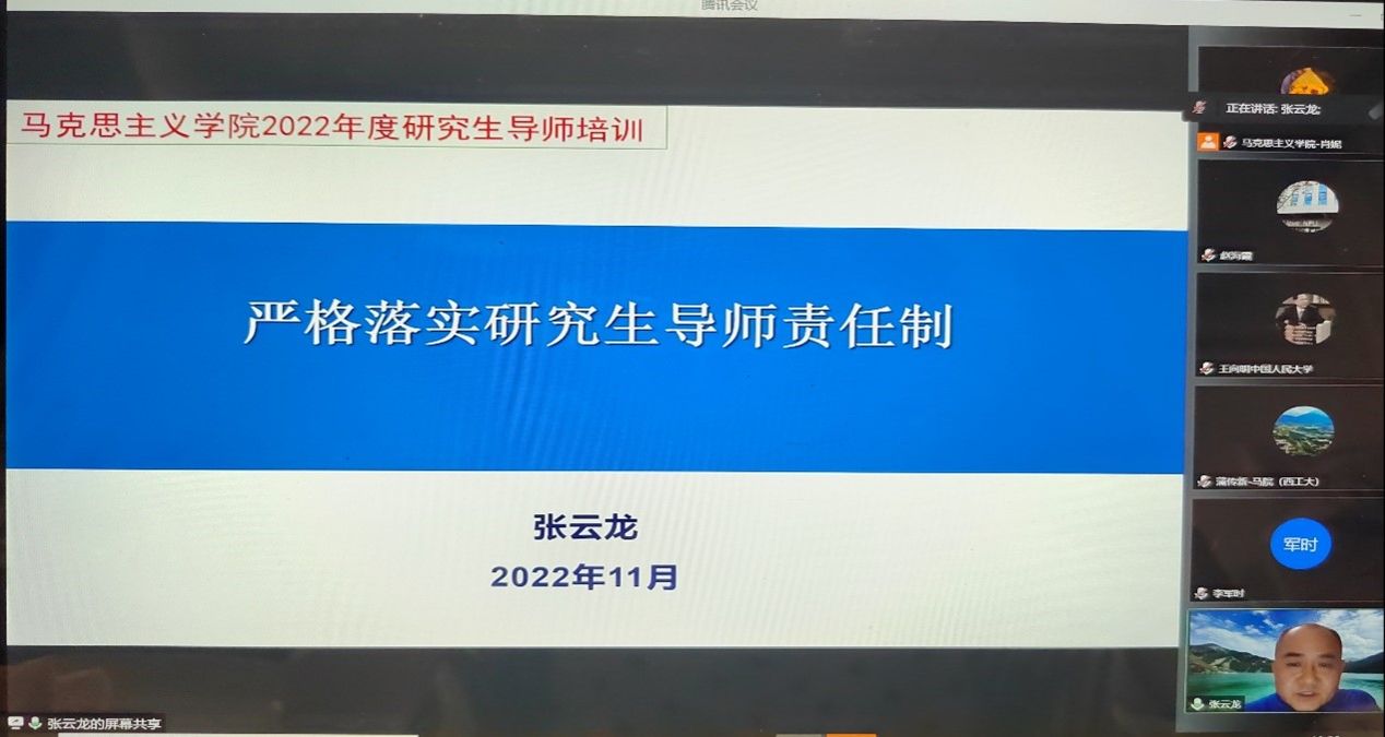 11月20日晚,beat365亚洲版官网在线召开2022年度研究生导师培训会,学院领导、研究生导师及青年教师代表等参加了培训会。培训会由副院长张云龙教授、党委副书记李刚副教授、院长杨云霞教授主讲。学院党委副书记(主持工作)蒲传新主持了培训会。