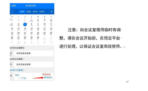 STEP3:取消会议室预定根据自身界面选择相应的途径(途径一):在“会议”—“会议室占用”—点击本人预定信息右侧图标“取消会议”。