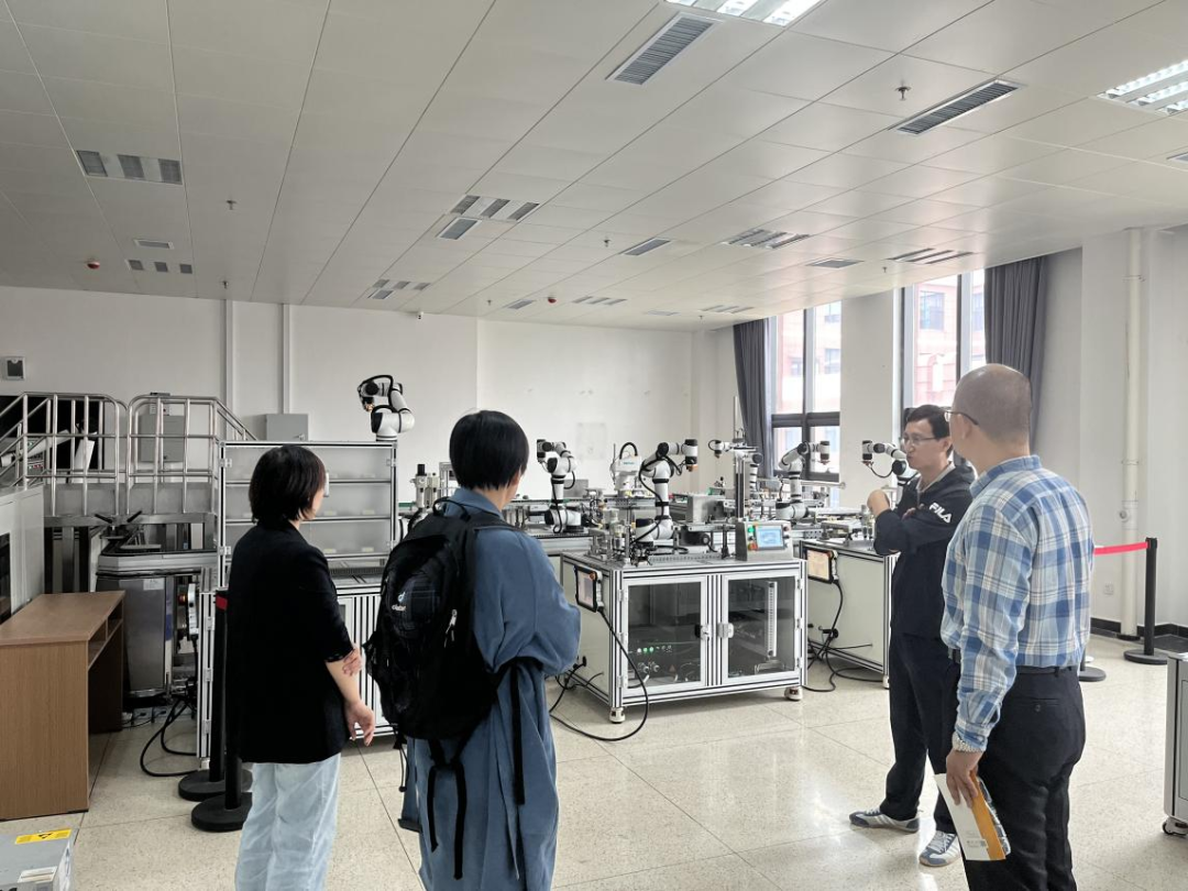 张照彦主任首先带领新葡官网老师参观了他们新能源汽车装配产线实训室,实训系统采用1:18大小的汽车模型及相关配件作为实训样品。该生产系统是基于多种机器人的自动化生产线系统,包括车身自动化立库单元、车身点焊打磨单元、电池装配电源、机盖装配电源、轮胎拆垛定位单元、车门冲压单元、挡风玻璃涂胶单元、智能立体车库系统单元、系统总控单元。参观期间双方教师就课程建设进行密切交流,王霞老师表示希望双方加强交流合作,整合优质教育资源、共同开发一套实验教材等。