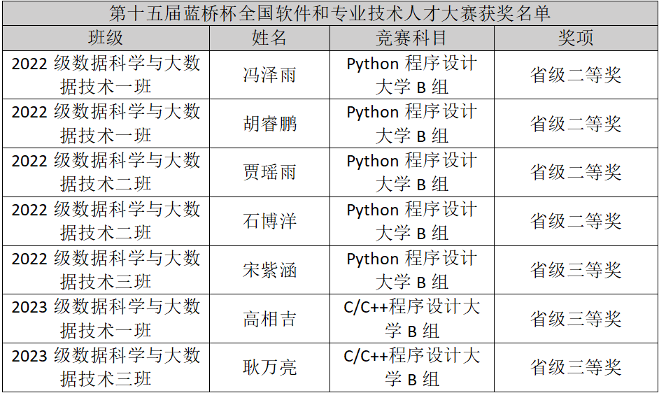 近日由工业和信息化部人才交流中心主办的2024年第十五届蓝桥杯全国软件和信息技术大赛省赛成绩公布,同时也揭晓了获奖名单,新葡官网7名同学获奖,其中冯泽雨,胡睿鹏,贾瑶雨,石博洋4名同学获得河北省二等奖,耿万亮,高相吉,宋紫涵3名同学获得河北省三等奖。