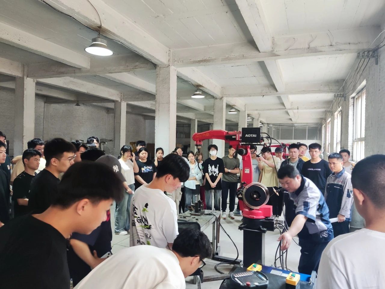 5月20日-21日,宙西森两位机器人工程师对机器人现场操作环境以及操作安全规程进行了细致的讲解,针对机器人本体构成、线路连接、配件更换、点动操作以及程序编写进行现场教学,使学生对已学习的理论知识有了更深层的理解与掌握。之后在保证安全的前提下,由企业工程师及跟课老师进行组织安排,依次有序地进行机器人实践操作。