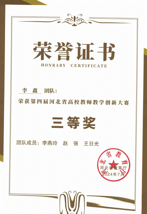 在2024年第四届河北省教师教学创新大赛中,经过4月1日校内选拔赛后新葡官网教师李鑫(团队)被推荐参加省赛,经过专家层层评审,最终取得了产教融合组别三等奖。