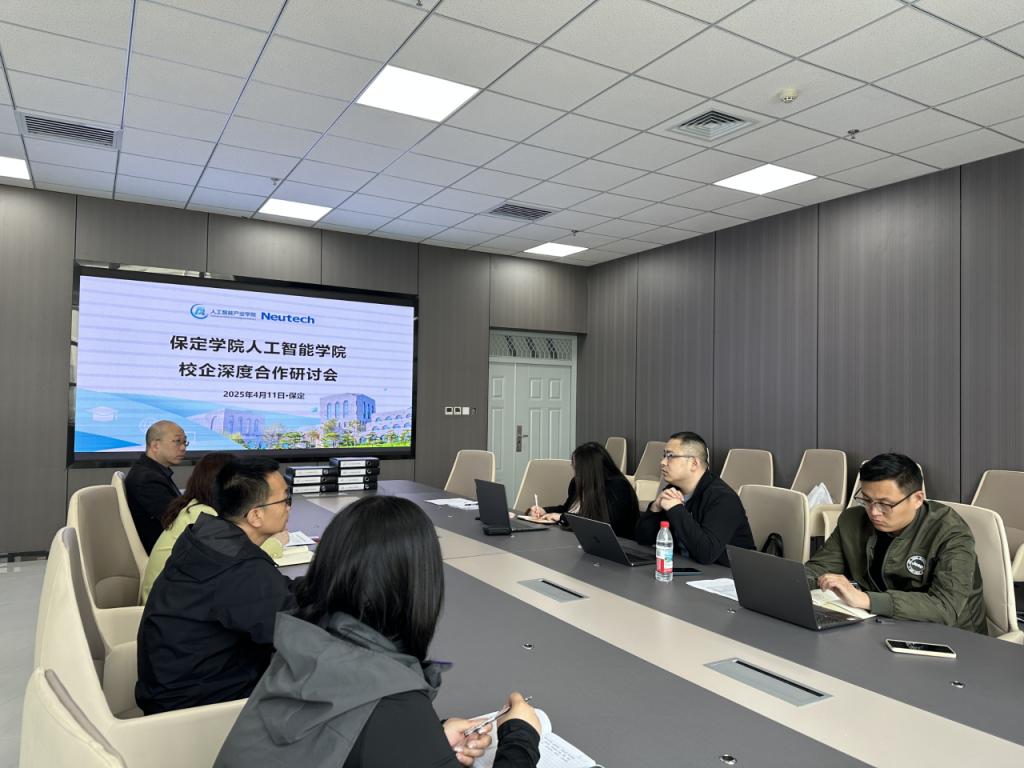 2025年4月11日下午,新葡8883官网AMG官网在人工智能产业学院会议室召开"校企深度合作研讨会"。新葡8883官网AMG官网院长李燕玲、副院长安雷、教研室主任刘健、教学秘书黄馨瑶,东软教育科技集团代表郭帅、刘沙沙、王伯栋、李尔谦等出席会议。会议重点围绕学校教务处下发的《校企深度合作办学专业建设督查简报》展开研讨,旨在进一步深化产教融合,提升人才培养质量。