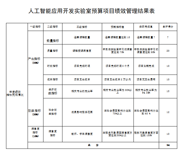 根据《保定市市级部门预算绩效管理工作考核办法(试行)》(保财〔2020〕75号﹞) 《新葡8883官网AMG官网预算绩效管理办法(试行)》(校字〔2023〕23号)有关规定,按照绩效信息及政务公开要求,现将人工智能应用开发实验室项目预算绩效管理结果进行公开,预算绩效管理结果见下。