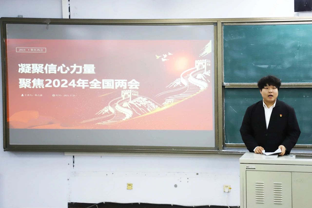 杨占森同志从两会的主要议程、大会讨论的热点问题和重要议题展开讲解。并号召大家结合自身学科特点,以实际行动贯彻两会精神,争做有理想、敢担当、能吃苦、肯奋斗的新时代青年,凝聚学科智慧和青年力量,助力中国式现代化,全面推进强国建设和复兴伟业。