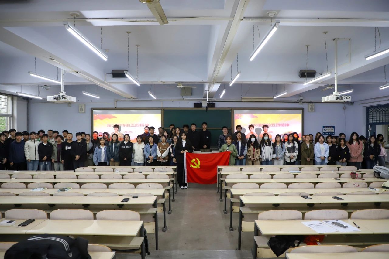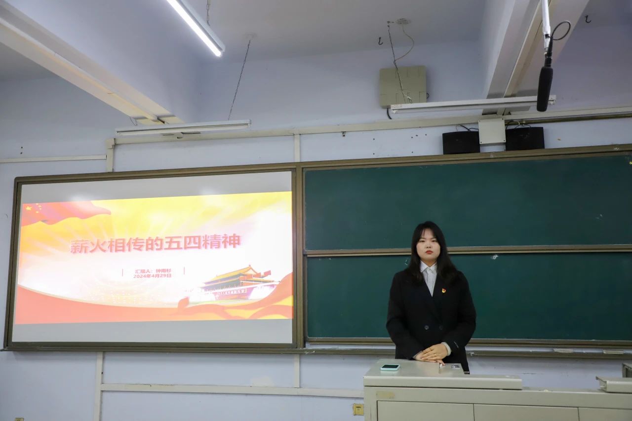 2024年4月29日晚上,新葡8883官网AMG官网学生党支部在B-202召开了“两周一课”常态化党课培训活动,此次党课主题为“薪火相传的五四精神”,由支部学生党员钟雨杉同志主讲,有新葡8883官网AMG官网学生党员及入党积极分子共82人参与学习。