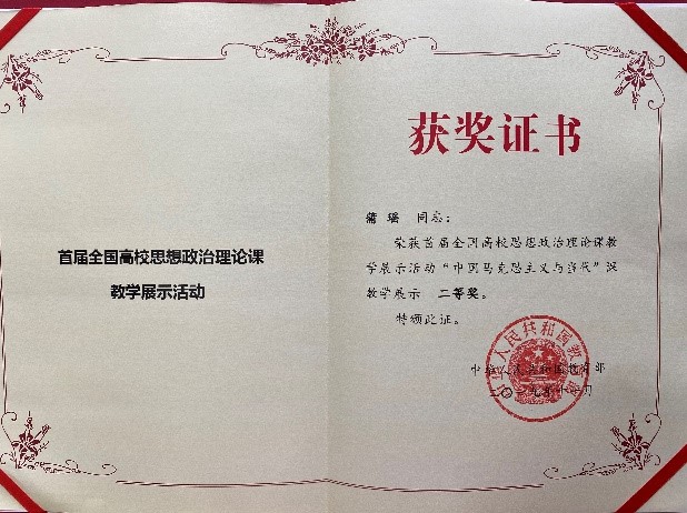 日前,教育部“首届全国高校思想政治理论课教学展示活动”证书下发,我院两位老师获此殊荣,贺苗老师获一等奖,蒲瑶老师获二等奖,这是我院在全国范围内思政理论课教学活动中取得的又一项佳绩。