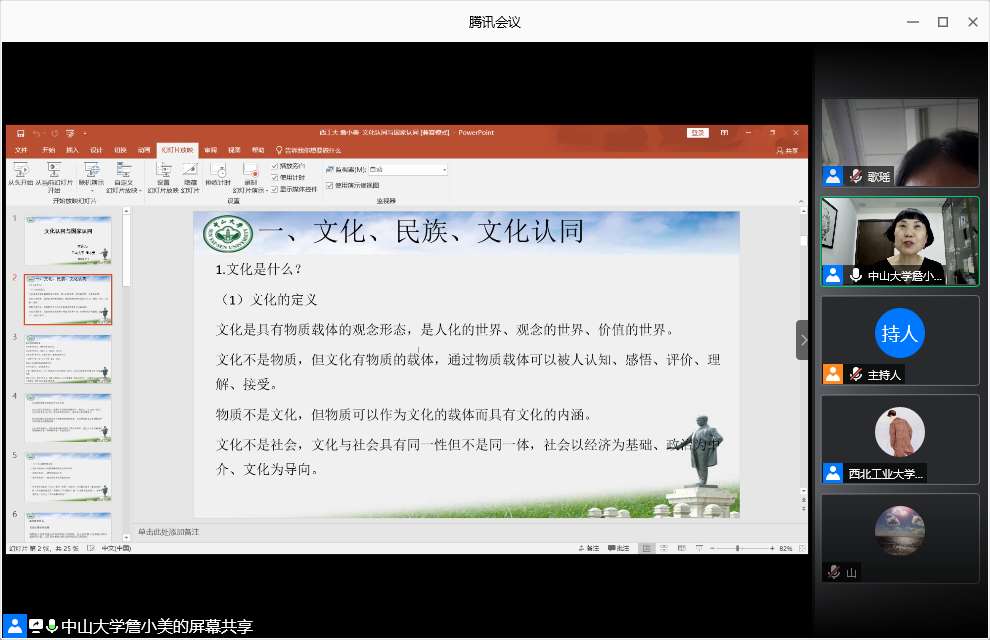 2020年7月1日,在建党99周年的特殊时刻,beat365官网学工部和beat365亚洲版官网特邀中山大学詹小美教授在云端做客beat365官网“翱翔名家讲堂”,进行“文化认同与国家认同”的学术讲座。beat365亚洲版官网和全国各地700余师生通过腾讯会议平台和哔哩哔哩网站观看学习。