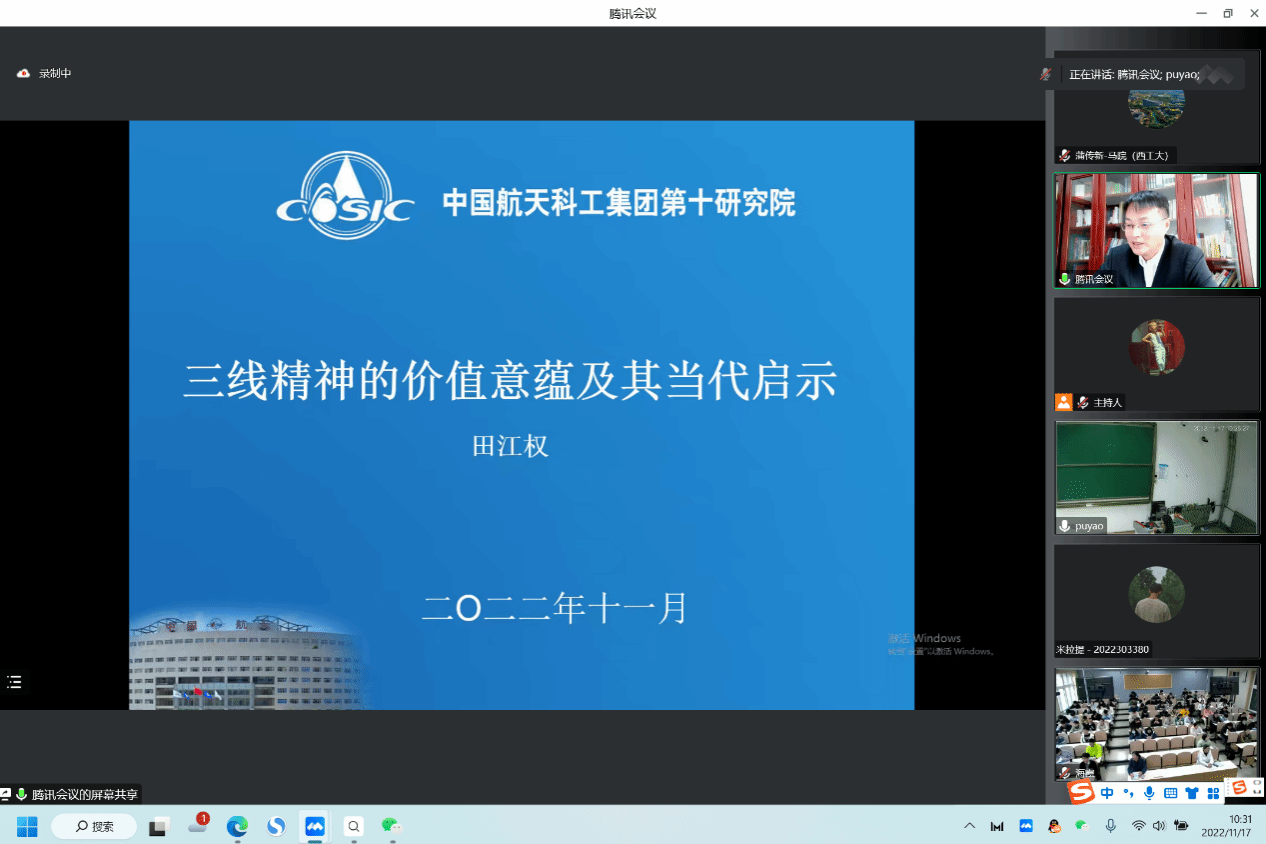 为深入贯彻落实习近平总书记关于“大思政课”的指示批示,深化巩固“四史”教育的课程效果,11月17日,beat365官网邀请到中国航天科工集团第十研究院田江权高级工程师做客翱翔名家讲堂,在云端开展《三线精神的价值意蕴及其当代价值》思政课程交流。本次活动由党委学生工作部主办、beat365亚洲版官网承办。beat365亚洲版官网党委副书记(主持工作)蒲传新、院长助理赵海霞,陕西省思政名师工作室负责人蒲瑶,思政课教师马新蕊、山磊、杜轶伦,以及《中国近现代史纲要》课程的学生共500余人参加了学习。
