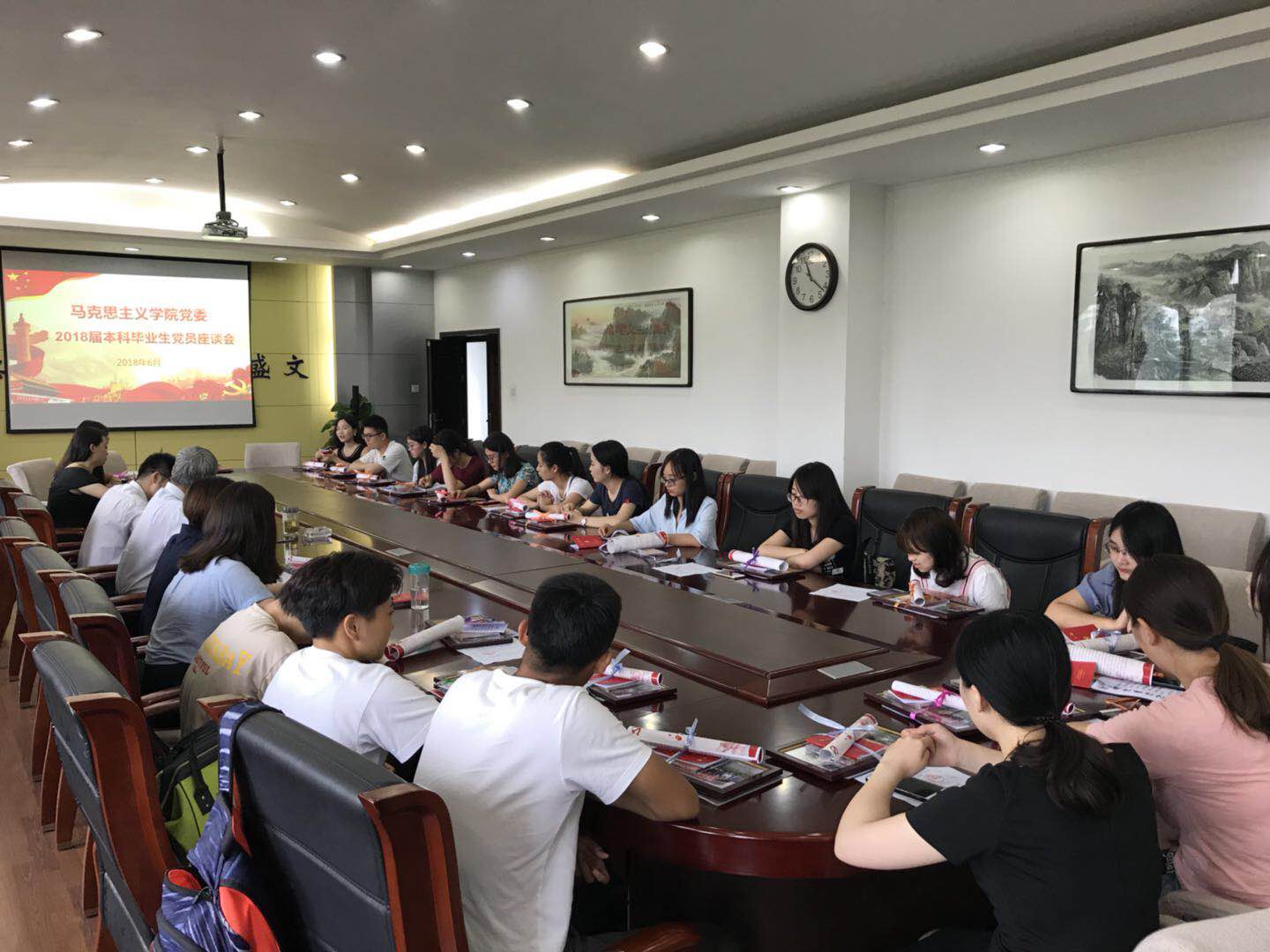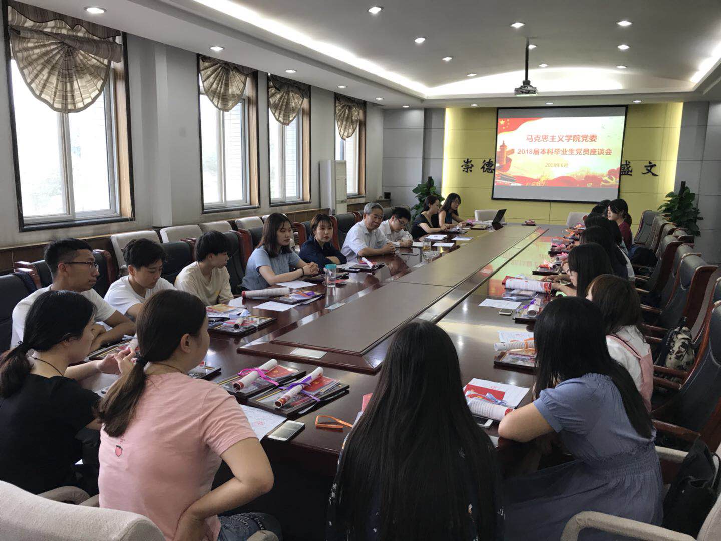 会场里,在每名党员的座位前,都摆放着一个精致的党员“毕业大礼包”。会议伊始,曹良玉先向大家详细介绍了学院党委为毕业生党员精心准备这份大礼,有学院微信平台“周末党员之声”栏目中最新专题《给你讲讲马克思》的系列语音故事光盘,有摘录了党员义务、权利以及组织生活相关知识,用于提醒党员严格自律、履行义务的初心手册,有精心装裱的毕业生党员合影和党员廉洁自律教育鼠标垫,以及学院党委写给毕业生党员的一封情真意切的“家信”。