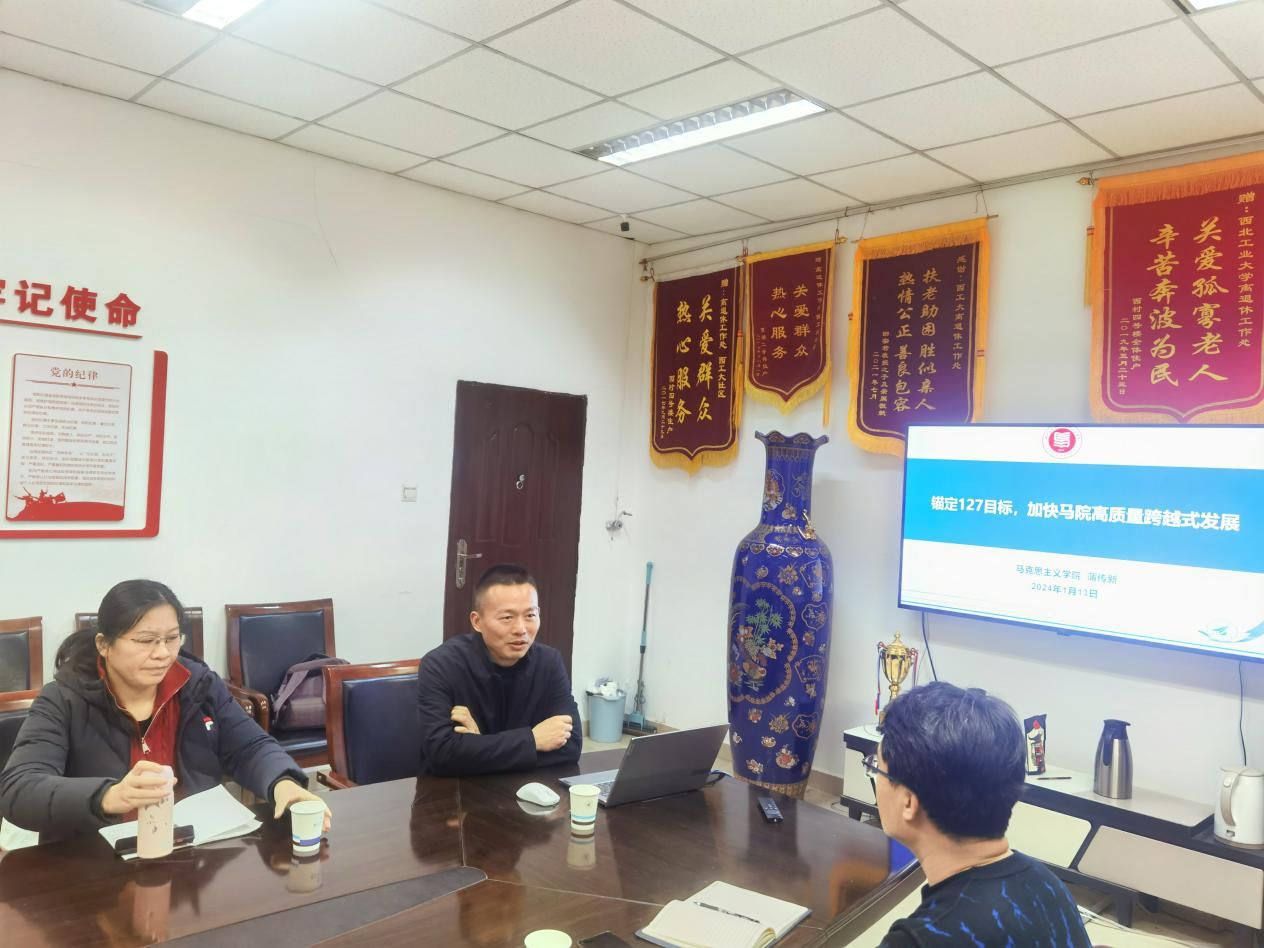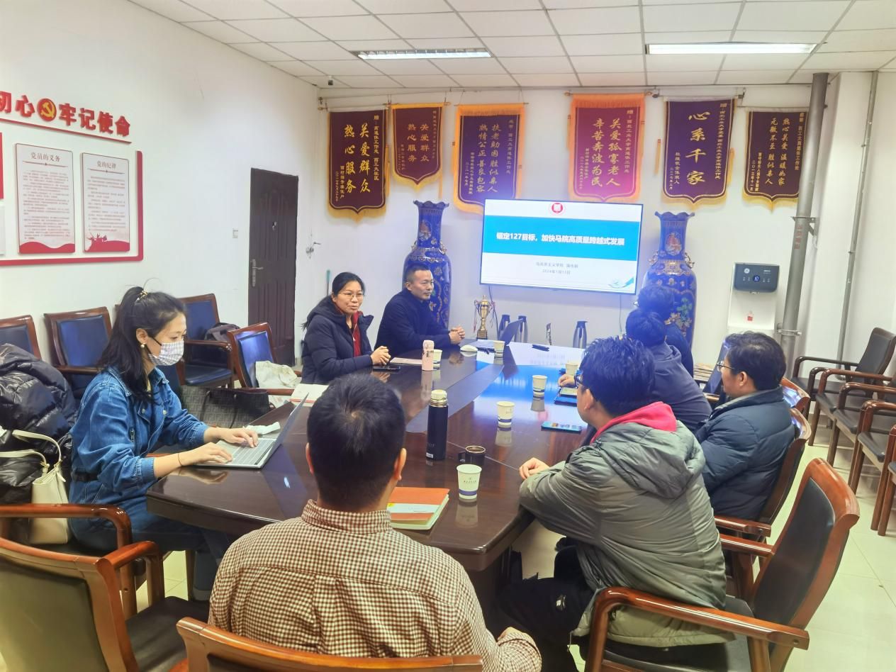 2024新年伊始,学院党委书记蒲传新以《锚定“127”发展目标,加快beat365亚洲版官网高质量跨越式发展》为主题,为德法与形势政策系党支部讲授新年第一堂专题党课,会议由系支部书记宫淑燕同志主持。