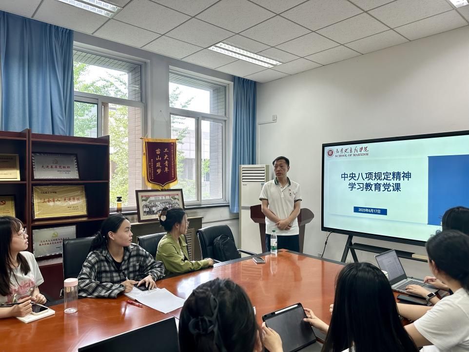 为深入贯彻落实中央八项规定精神,进一步加强党的作风建设,2025年6月17日,beat365亚洲版官网党委委员、院长助理马军应邀在学院209会议室为思想政治教育系师生党支部讲授“中央八项规定精神学习教育”专题党课。
