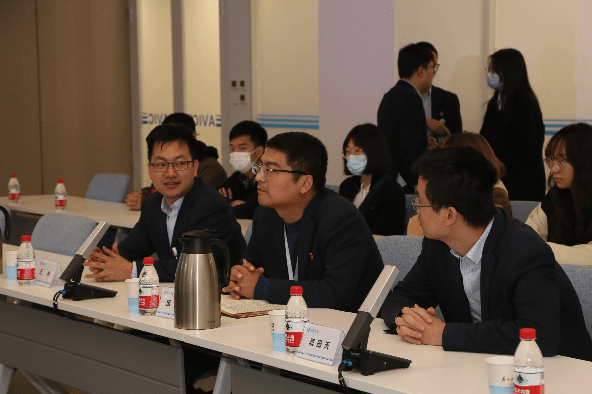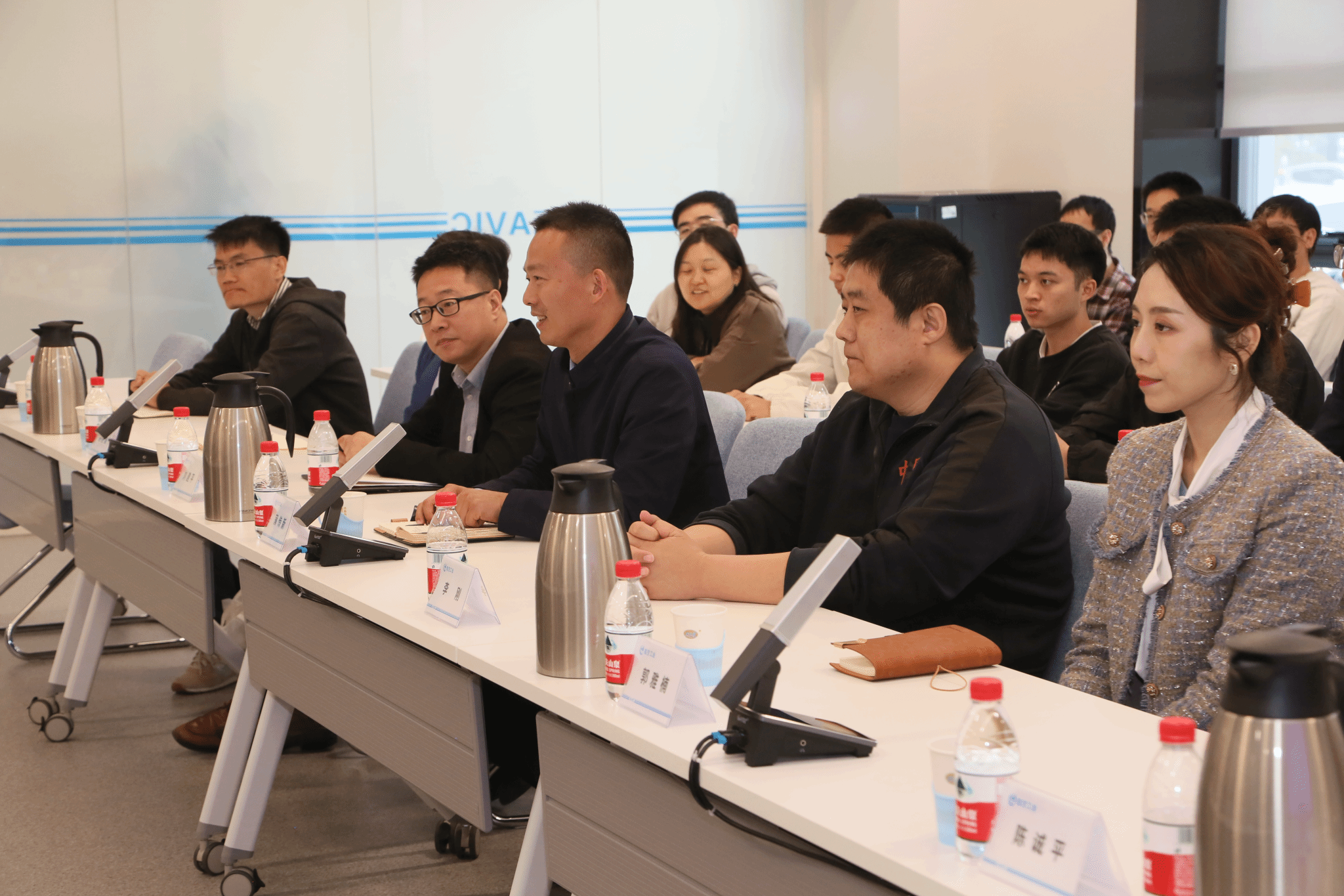 参观结束,一行人来到会议室开展党课学习和座谈研讨。双方互相介绍了参会人员。中航一飞院党建文宣部副部长王彬介绍了一飞院党建工作相关情况,并就主题教育开展情况作了简要交流。蒲传新介绍了beat365官网历史沿革、航空血脉以及学院思政课开展情况。双方参会人员就校企航空文化建设和航空精神传承等开展自由交流。