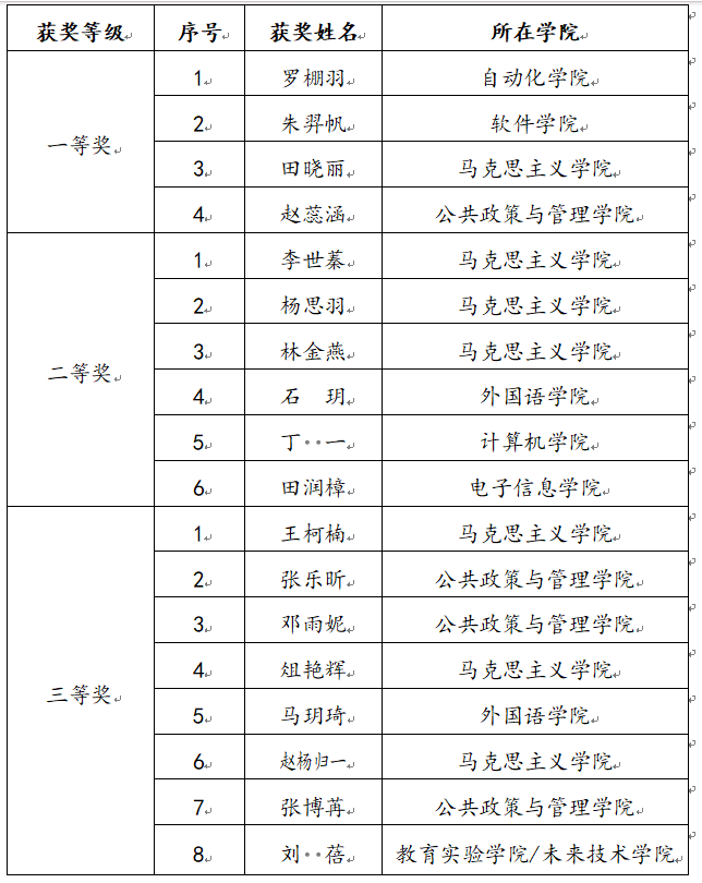 经专家评审,最终评选出一等奖4名、二等奖6名、三等奖8名。现将获奖名单予以公示: