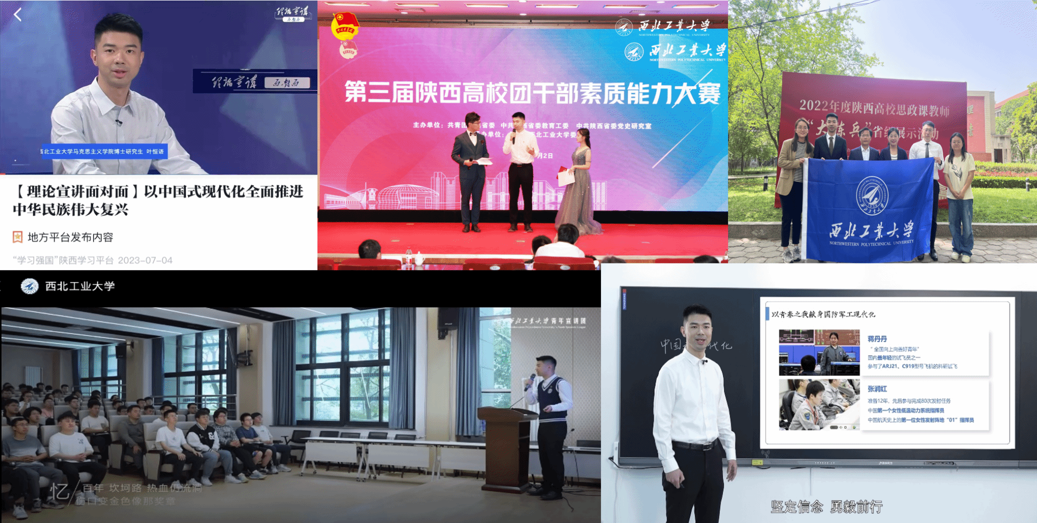 他坚持发挥马理论专业优势,主动走上大中小学课堂讲台,讲好党的创新理论成果。一方面,在“以赛促练”中提升理论宣讲过硬本领,参加多项省级教学展示、竞赛及培训,以全省第一名的成绩斩获第三届陕西高校团干部素质能力大赛一等奖,获评陕西高校思政课教师“大练兵”教学团队能手,担任校青年宣讲团讲师,为上百名在校生开展“推进中国式现代化的青年力量”主题宣讲,不断巩固壮大“总师育人文化”的主流思想舆论。另一方面,利用网络新媒体渠道拓展宣讲覆盖面,参加中共陕西省委宣传部推出的“理论宣讲面对面”栏目录制,受学习强国平台报道;在共青团陕西省委学校部指导下,参编《陕西中学团课讲义》并录制“社会主义核心价值观”主题团课;上镜录制陕西网五四青年节主题MV《青春的样子》、重庆日报《理响青年》栏目,以青年视角和大众语言传递正能量,发扬理论联系实际的优良作风和学术品格。