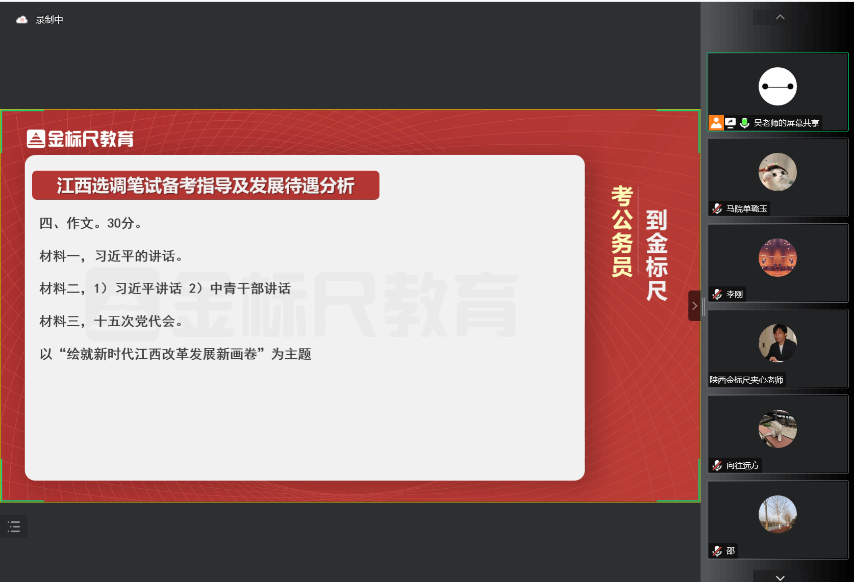 为帮助2023届毕业生更深入的了解“公职类”就业形势及江西选调考试情况,提前掌握江西招录特点,解答同学们对于选调生的困惑,beat365亚洲版官网联合金标尺教育特推出“江西选调公告解读及备考指导”就业指导系列讲座。本次讲座邀请嘉宾为来自金标尺教育的吴沈川老师,由兼职辅导员单璐玉主持。