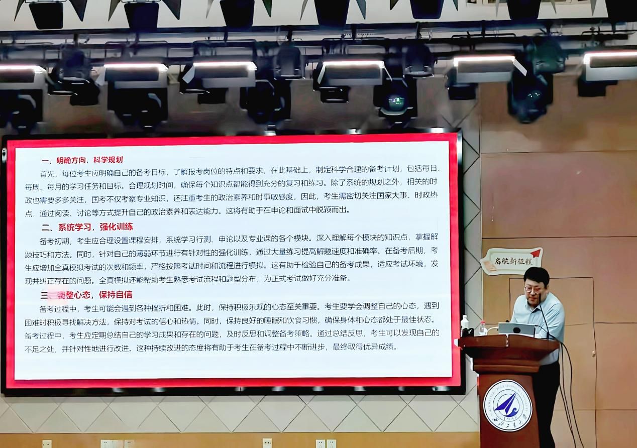 随后,国仲老师围绕选调生、公务员等学生关切的就业方向,从考试公告解读、备考技巧、备考指导三个方面进行了系统讲解,重点解析了陕西选调与国考省考的考情动态和发展趋势,并结合真实案例分析了备考中的常见问题和高效策略。