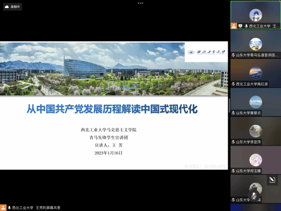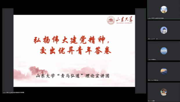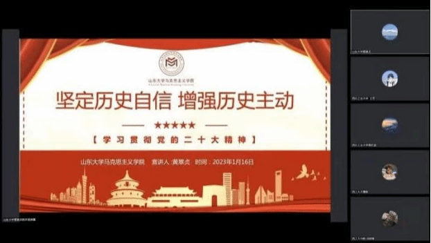 为进一步引导广大青年学生深入学习宣传贯彻党的二十大精神,深入推进党的二十大精神入脑入心、走实走深、见行见效,持续在高校青年中掀起学习热潮,2023年1月16日晚七点,beat365亚洲版官网青马先锋学生宣讲团与山东大学beat365亚洲版官网“青马弘道”理论宣讲团联合举办“联学共建齐宣讲,同心同行谱新篇”主题宣讲活动。