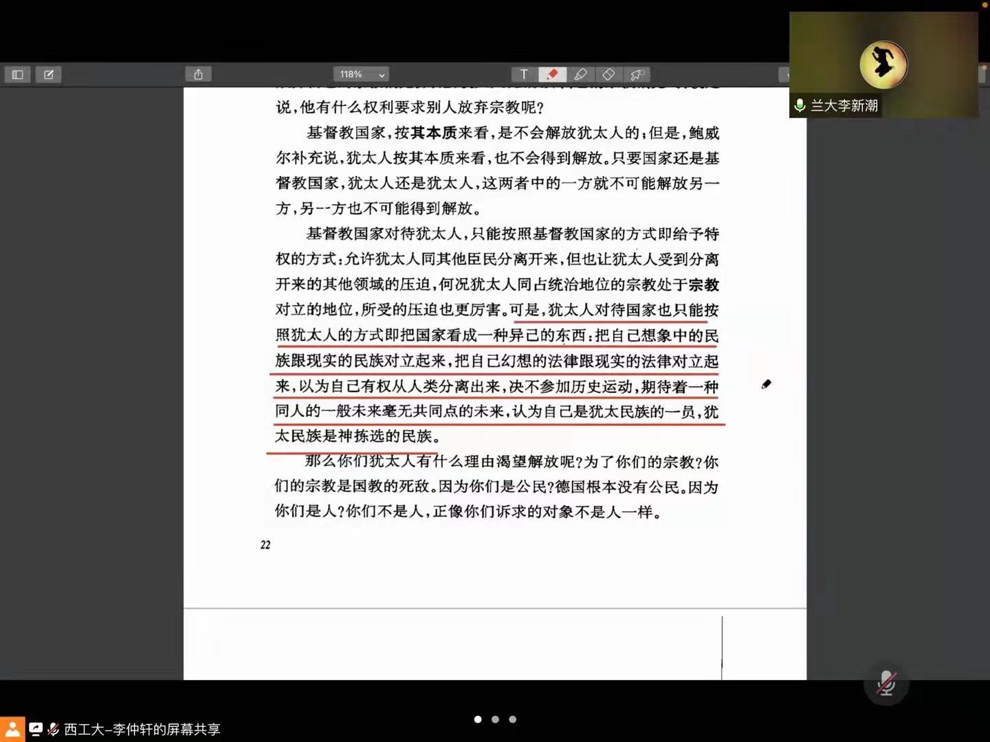 2022年4月23日迎来了第27个世界读书日,beat365亚洲版官网第31期的“启真明智”读书会通过腾讯会议顺利举行。本次读书会由学院助理教授张起梁主持,西工大马院张云龙老师、曹瑜老师、兰州大学青年教师李新潮坐客云端与硕博同学一起阅读马克思和恩格斯的经典著作,本次读书会的阅读内容为《论犹太人问题》。