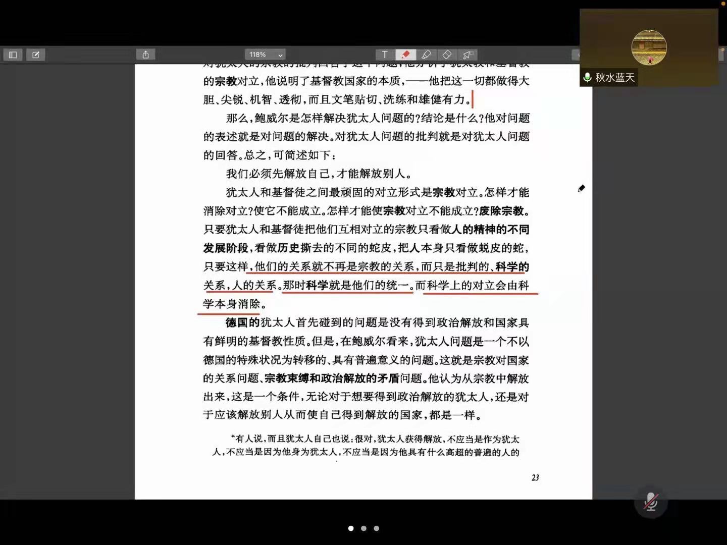硕士生邵丽萍解读到,马克思批判了鲍威尔将政治解放视为人的最终解放的问题。鲍威尔认为犹太人的问题是犹太教与基督教、犹太人与基督徒之间的对立。将犹太人问题简单的视为是宗教间的冲突、对立,认为废除宗教,犹太人就能够在国家内获得平等的权利和地位。马克思批判了鲍威尔这样的观点,指出犹太人由于其政治地位与其经济地位不对等,因此他们渴望在政治上获得自由与权利。而在不同的国家,对于这个问题有不同的表述,在政治解放比较彻底的国家内,这就不是一个宗教问题,而是一个世俗问题。曹瑜、李新潮和张云龙老师就政治解放的具体含义,以及对于政治解放与宗教解放的问题做了详细的解答。