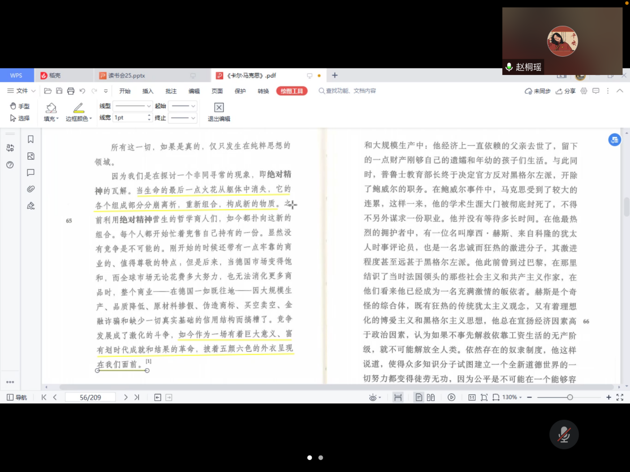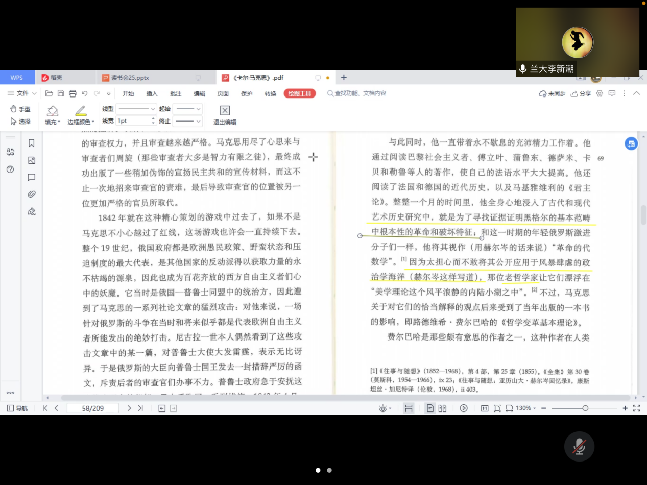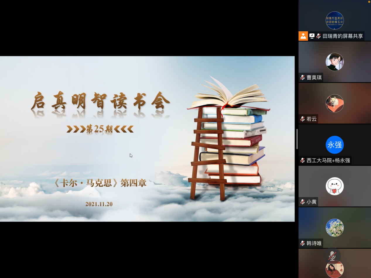 2021年11月20日,第25期启真明智读书会顺利举行。本次读书会邀请到兰州大学beat365亚洲版官网李新潮老师与同学们一起阅读以赛亚·伯林所著《卡尔·马克思:生平与环境》的第四章的内容,beat365亚洲版官网教授张云龙和助理教授杨永强参加本次读书会,读书会由硕士生田瑞青主持。