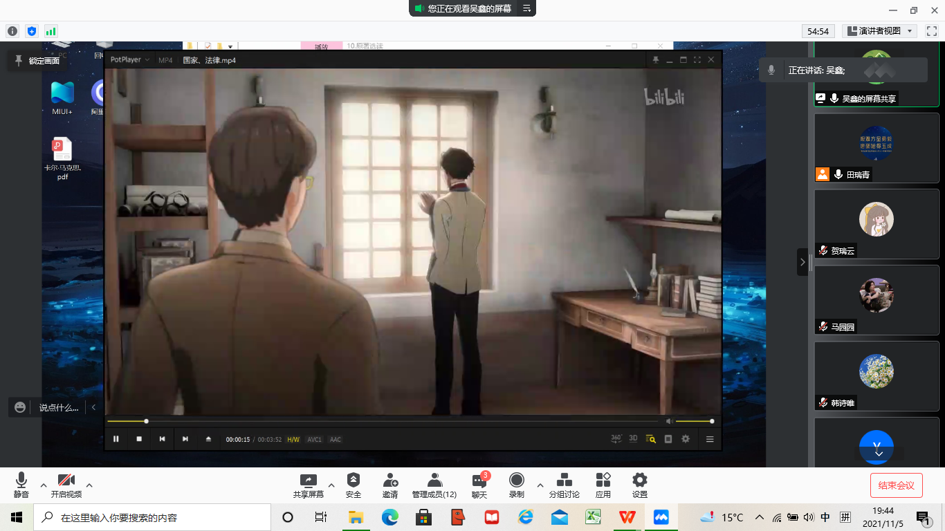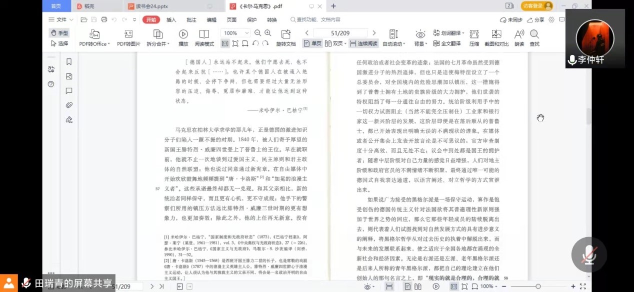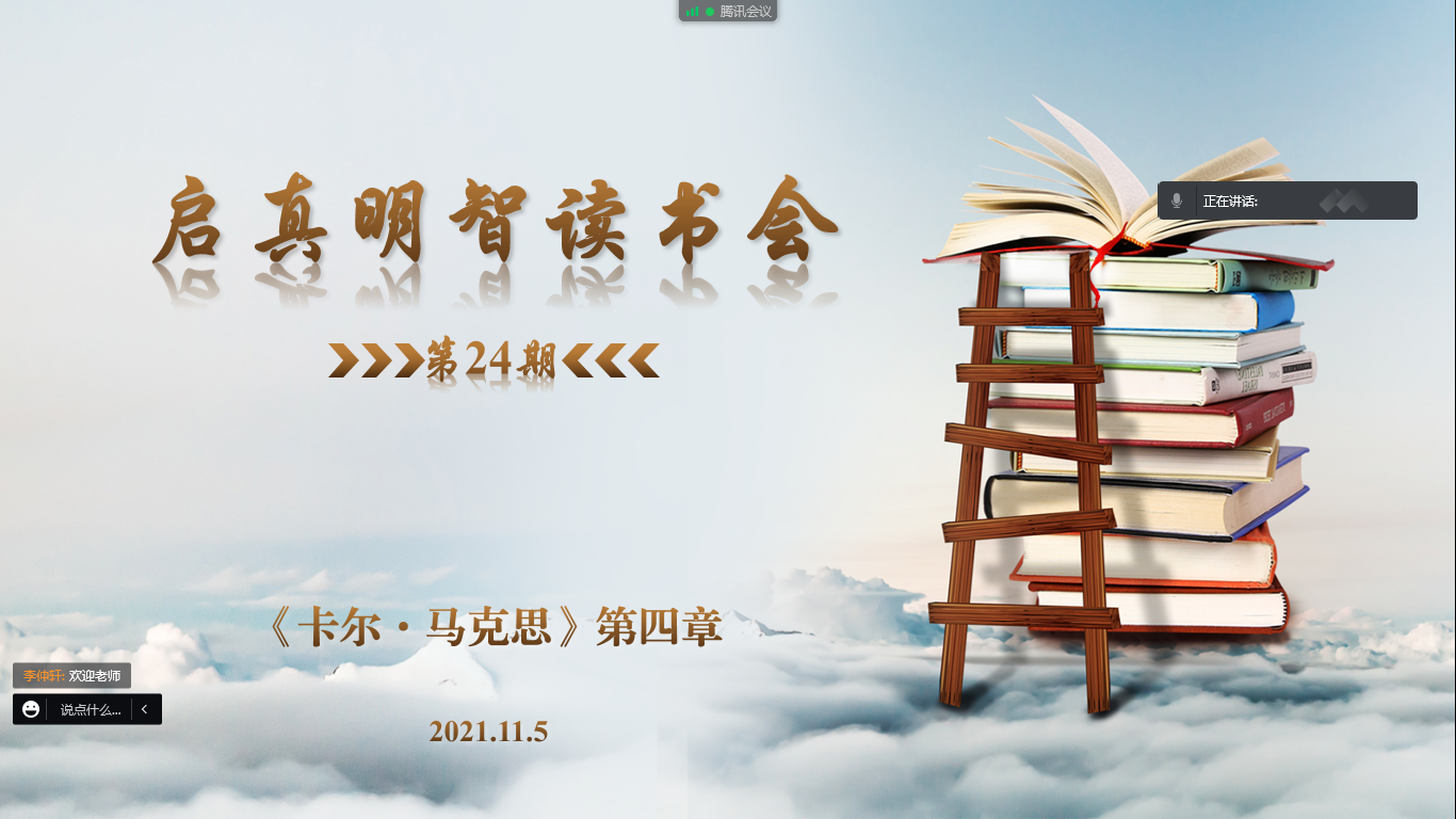 2021年11月5日,启真明智读书会第24期通过腾讯会议顺利举行,本期读书会阅读内容为以赛亚·伯林所著《卡尔·马克思:生平与环境》第四章的内容,beat365亚洲版官网教授张云龙,助理教授吴鑫、杨永强参加读书会,与同学们交流学习,硕士生田瑞青主持本期读书会。