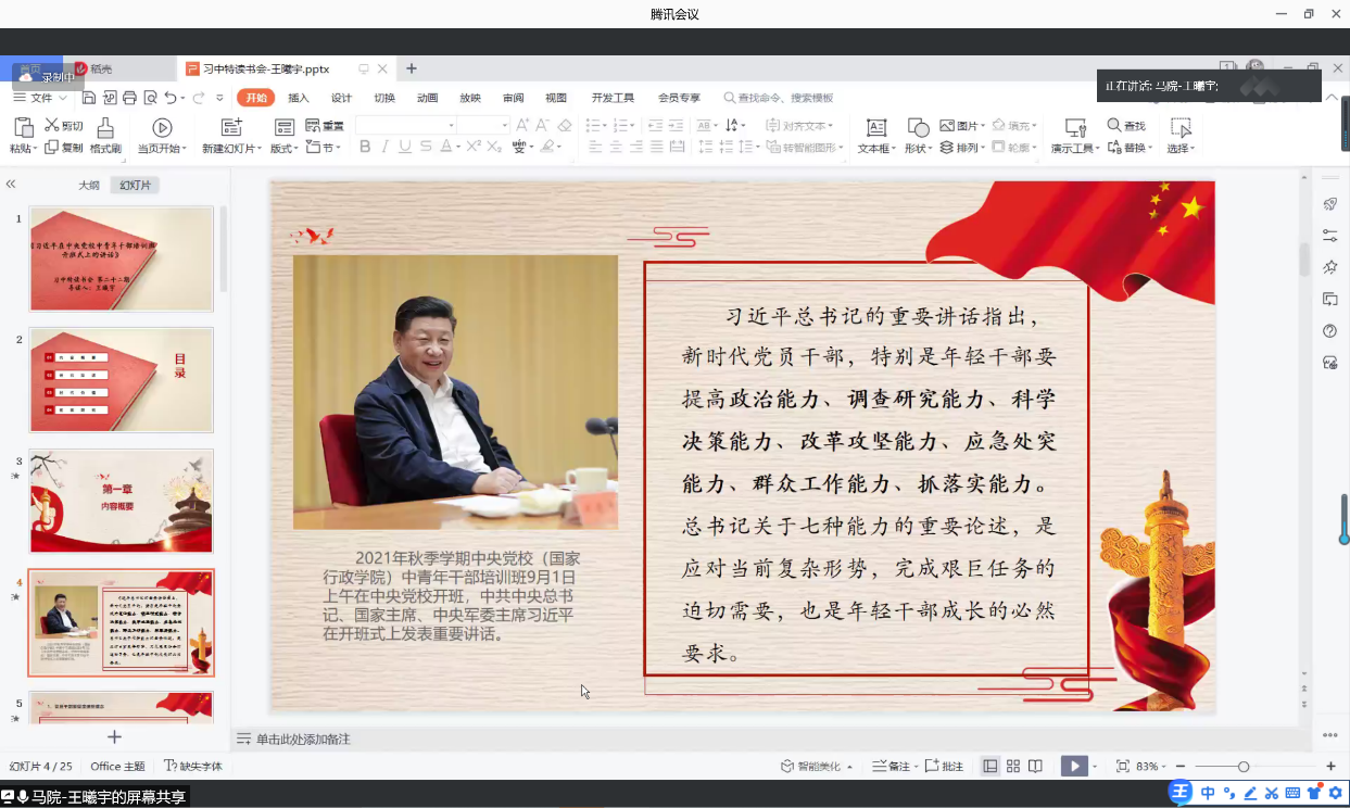 读书会的第一位导读人是我院硕士生王曦宇同学。她从四个方面展开:第一,内容概要。习近平总书记的重要讲话指出新时代党员干部要提高的七种能力,并提出了新时代对党员干部的四大要求,一是党员干部要坚定理想信念,这个理想信念就是马克思主义信仰、共产主义远大理想、中国特色社会主义共同理想;二是一切从实际出发,这一要求是我们想问题、做决策、办事情的出发点和落脚点;三是党员干部要敢于担当,干事担事,是干部的职责所在,也是价值所在;四是党员干部要坚持原则,坚持原则是共产党人的重要品格,是衡量一个干部是否称职的重要标准。其次,针对每个部分,阐述了具体内容,让大家进一步理解讲话的主要内容和扩展意义。第二,研究综述。分别围绕两大层面进行了研究综述。第一层面,围绕讲话重大意义和精神实质展开热议;第二层面,围绕讲话内容展开研究综述,相继从习近平坚定理想信念、习近平强化政治意识理念两个方面论述。第三,时代价值。深入理解和把握讲话内容后,可以从四个方面入手探讨时代价值。一是坚定理想信念,把坚定理想信念与对党忠诚联系起来;二是坚持一切从实际出发,党员干部要脚踏实地,以事实为依据;三是坚定政治意识,加强理论知识的学习,学习与本职工作相关的新知识新技能,不断完善履职尽责必备的知识体系;四是要敢于担当,以实践出真知,提高党性修养,砥砺政治品格,锤炼过硬本领,以忠诚干净担当的实际行动,在全面建设社会主义现代化国家新征程中奋勇争先、建功立业。最后,研究拓展。在新时期,如何更好的落实习近平同志对于中青年党员干部提出的几点要求?有待同学们进行思考。