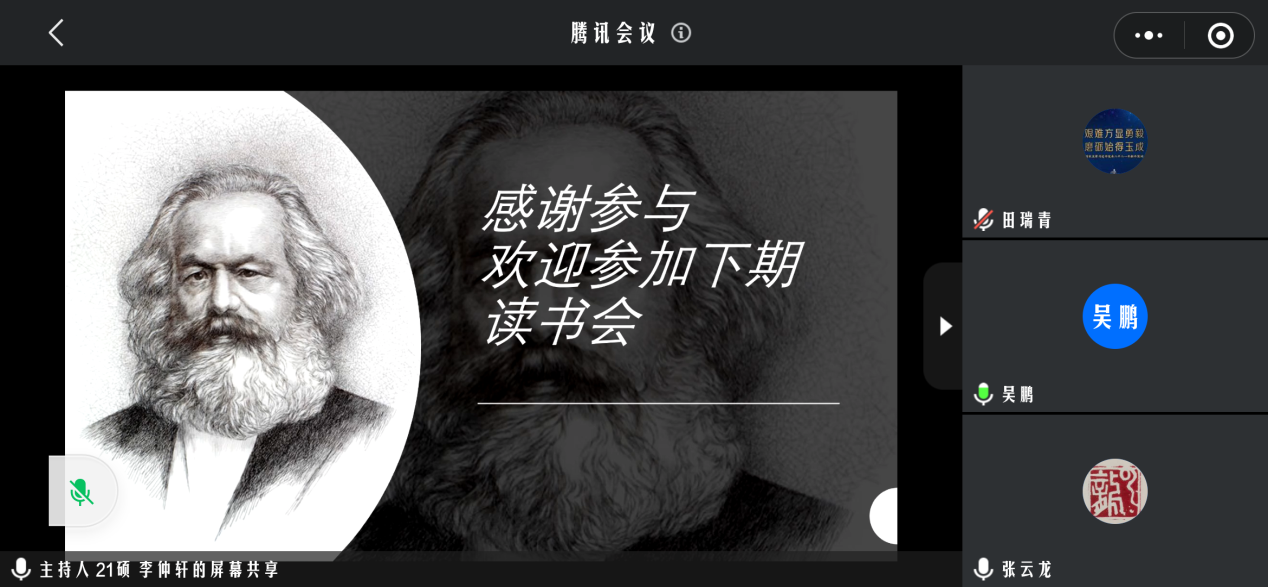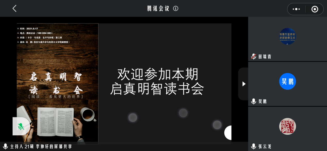 2021年9月17日,启真明智读书会通过腾讯会议顺利举行,本次读书会邀请到西安交通大学beat365亚洲版官网助理教授吴鹏与同学们一同阅读经典,我院张云龙、杨永强两位老师与博、硕师生参加读书会,读书会由硕士生李仲轩主持。