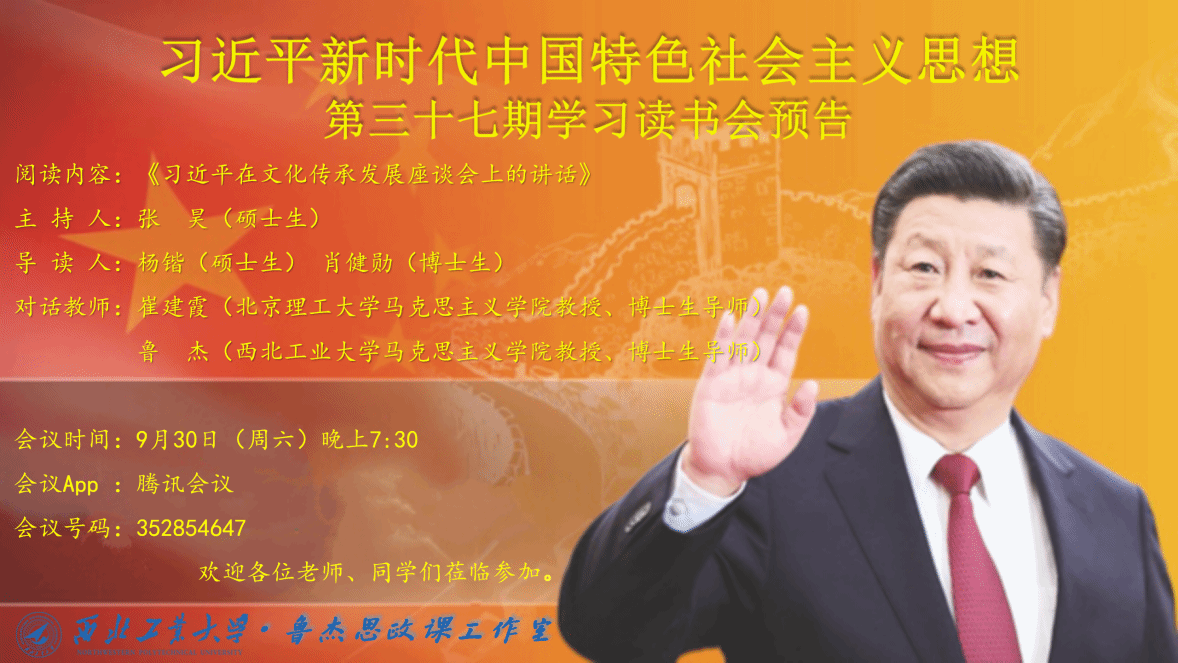为全面学习贯彻党的二十大精神,推进习近平新时代中国特色社会主义思想进教材、进课堂、进头脑。2023年9月30日,beat365亚洲版官网习近平新时代中国特色社会主义思想学习读书会第三十七期活动主题围绕《习近平在文化传承发展座谈会上的讲话》进行学习研讨。本次读书会由学院思想政治教育系主任、博士生导师鲁杰教授发起,学院硕士生张昊主持,北京理工大学beat365亚洲版官网博士生导师崔建霞教授作为对话教师应邀参加。